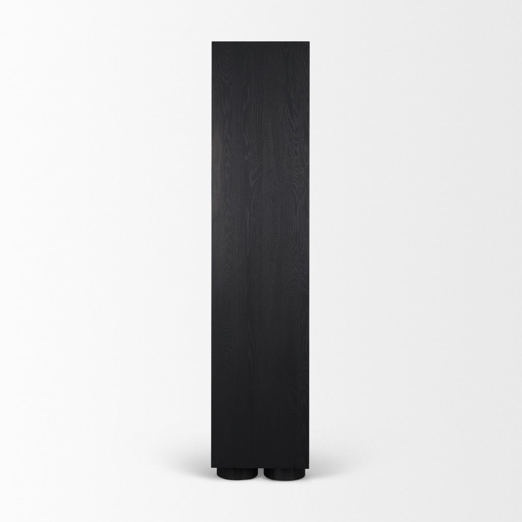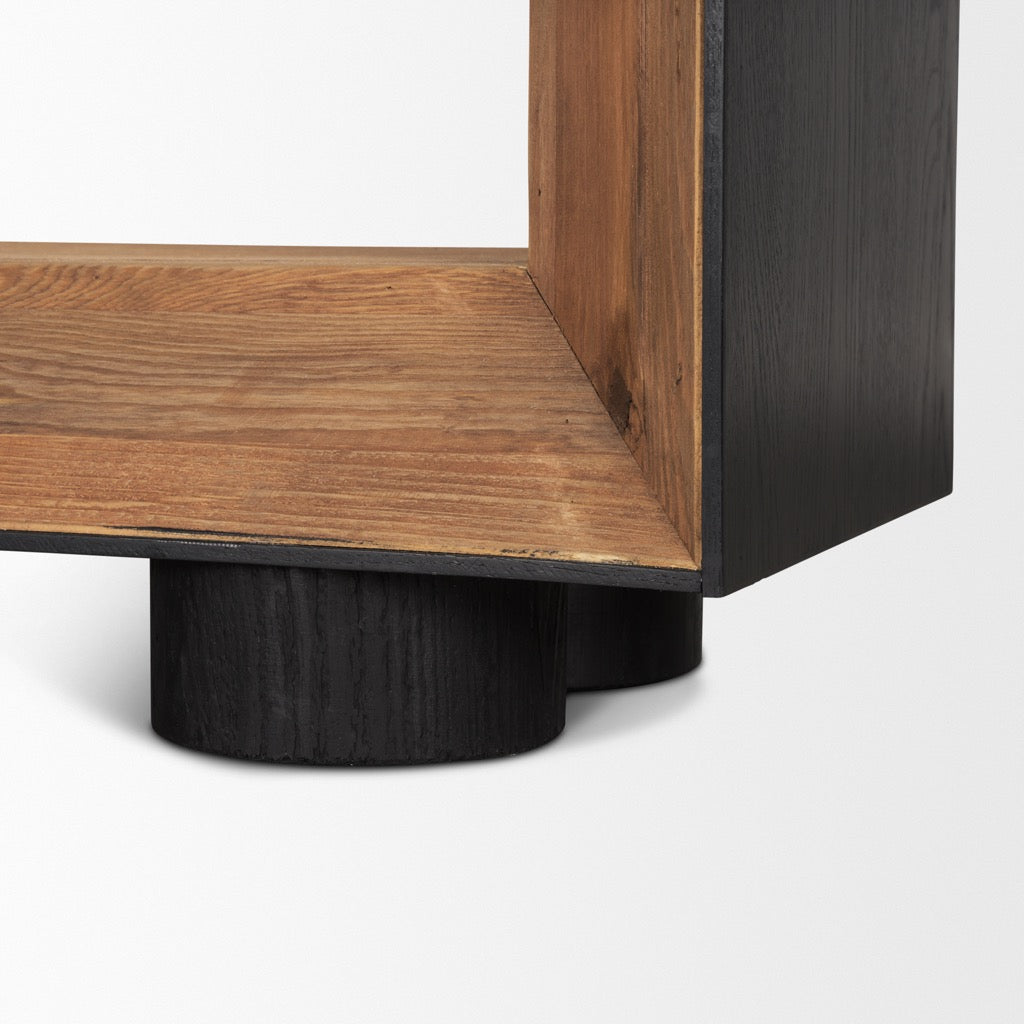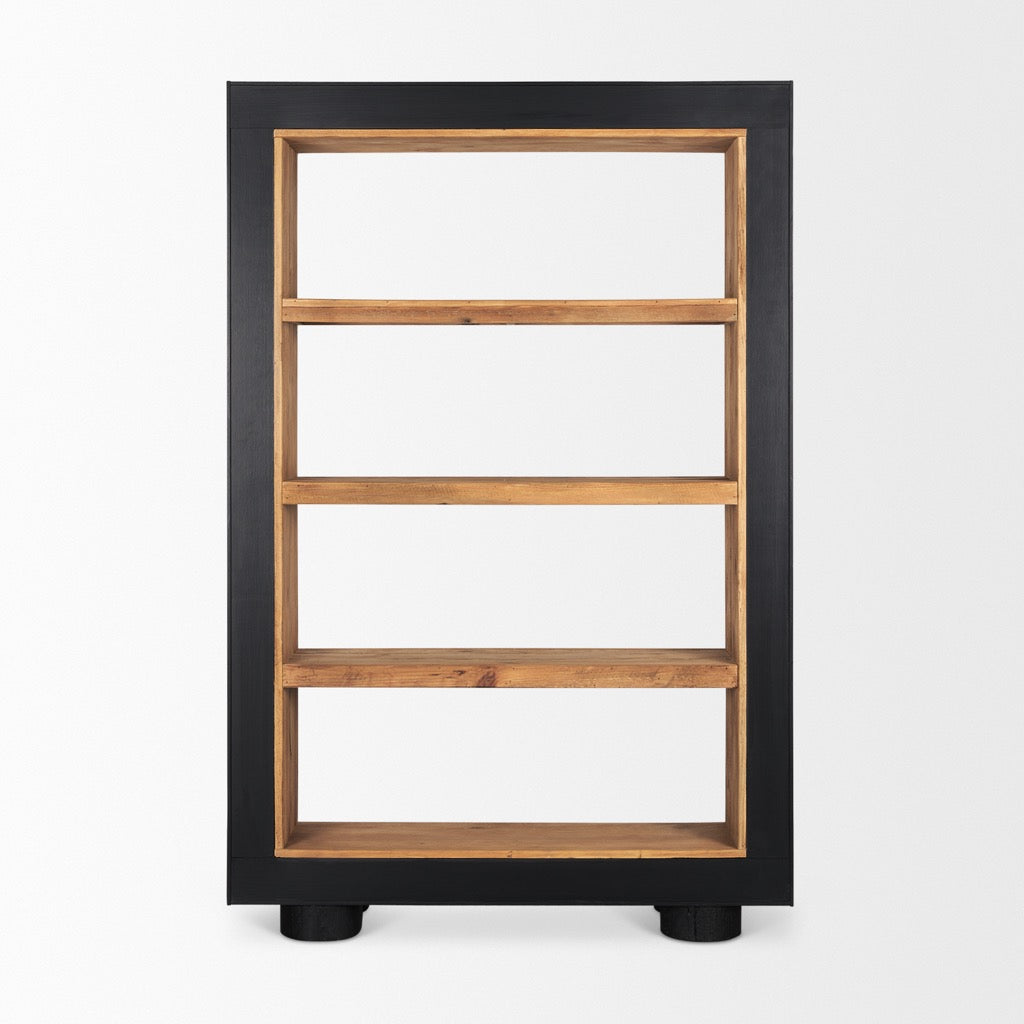 The Tabor Bookcase showcases a blend of rustic charm and modern sophistication, crafted from natural, recycled pine and encased within a sleek black oak veneer waterfall frame.