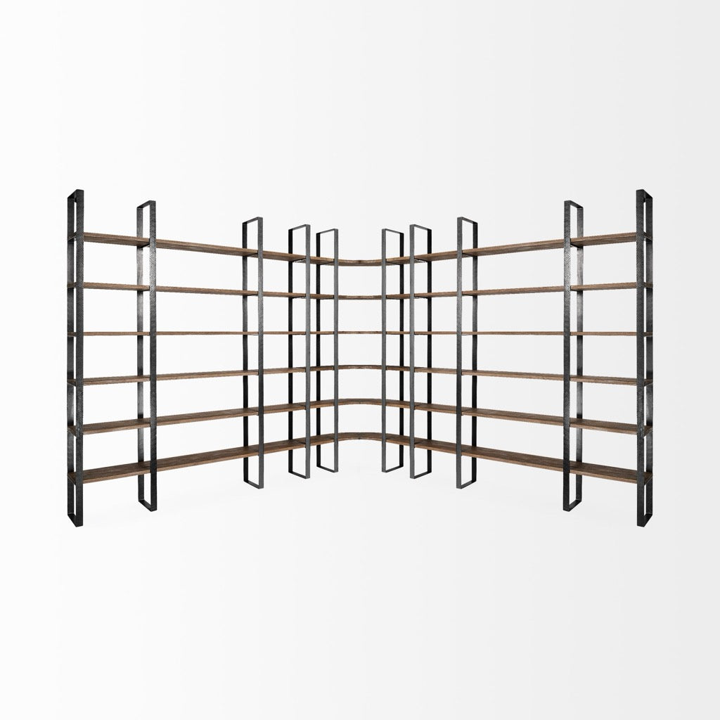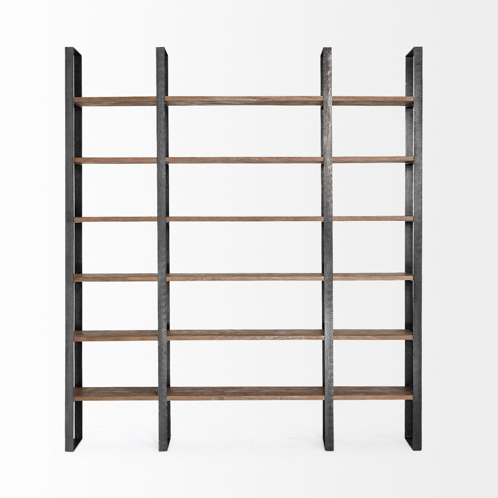 The Taunton II is a simple, yet elegant shelving unit made of wood. It features multiple wooden shelves supported by four metal beams.