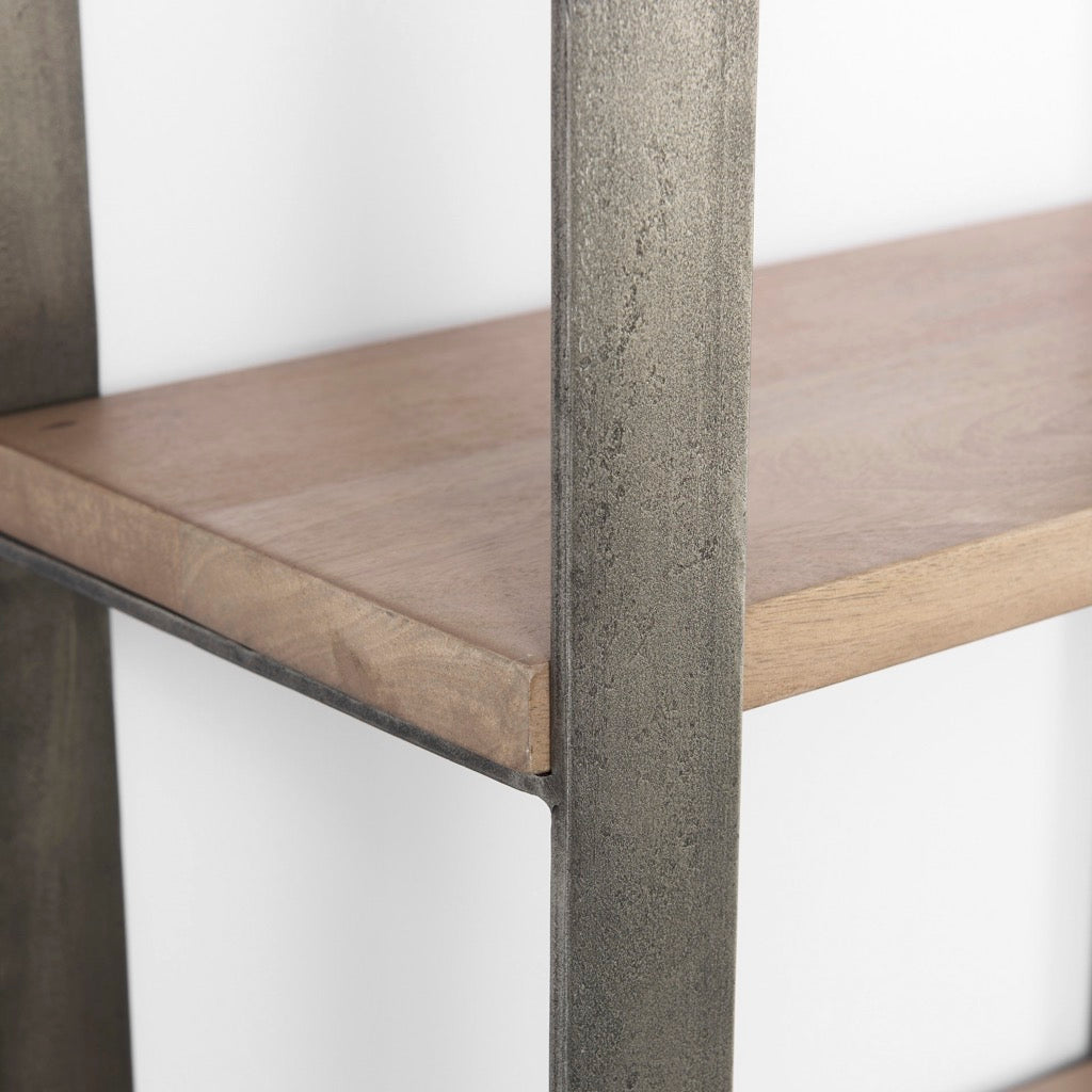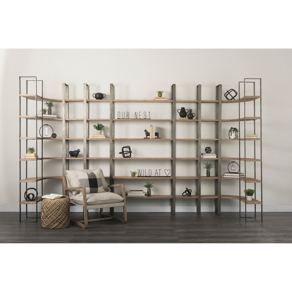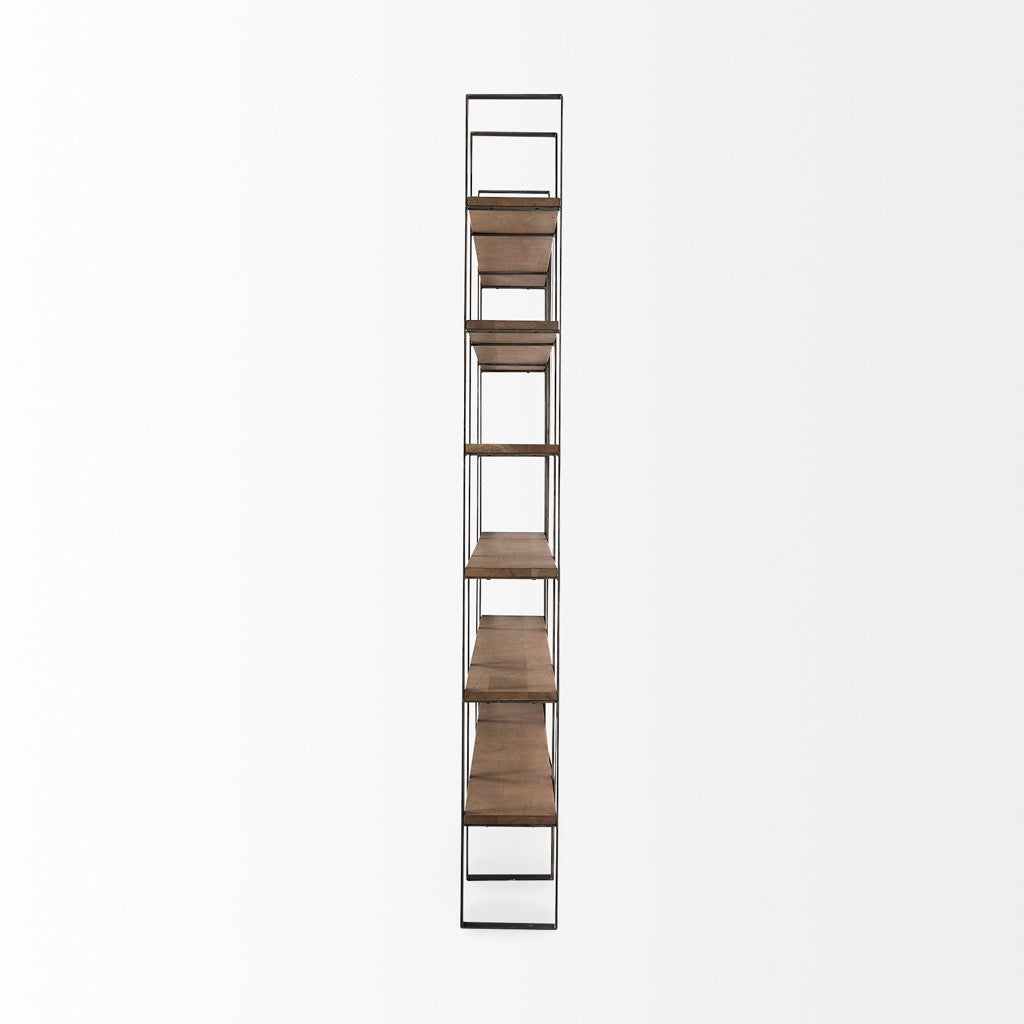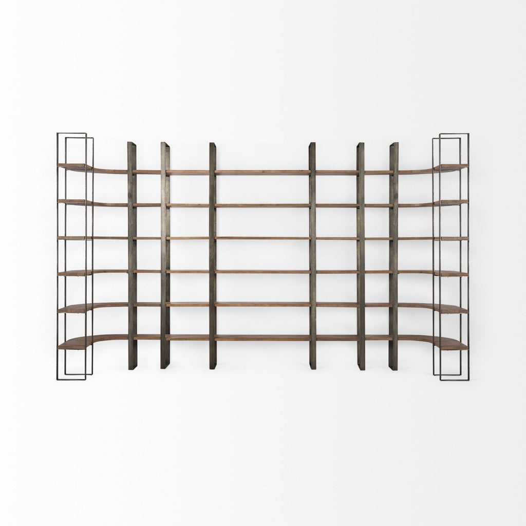 The six-tier Taunton Shelving Unit boasts a striking metal frame with an antique nickel finish and sturdy medium brown, wood shelves.
