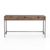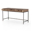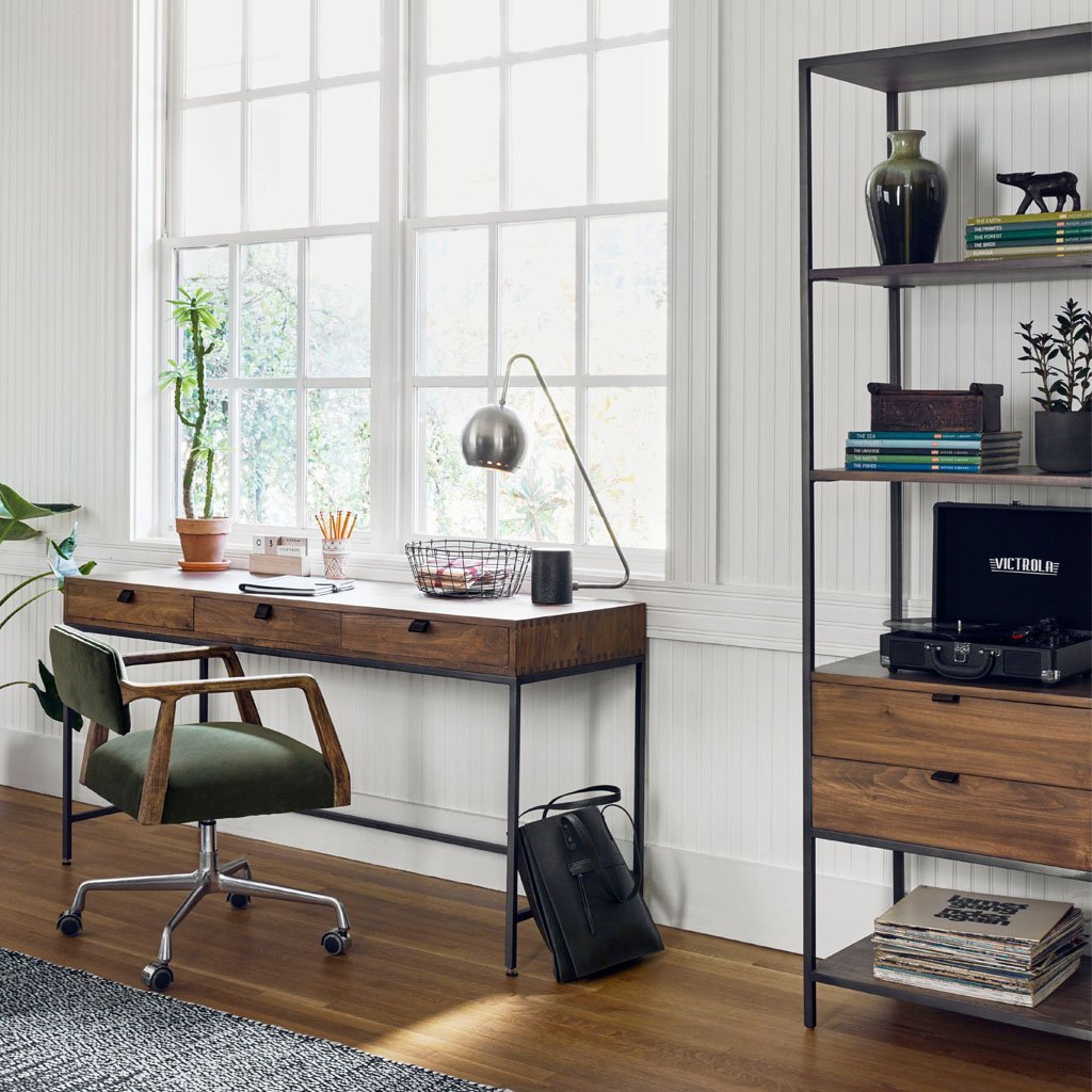 Inspired by clean mid-century design, greyish auburn poplar offers plenty of desk storage by way of three spacious drawers. Metal-secured leather pulls add a textural element of surprise. Great solo or paired with matching corner desk, file cabinet or credenza.