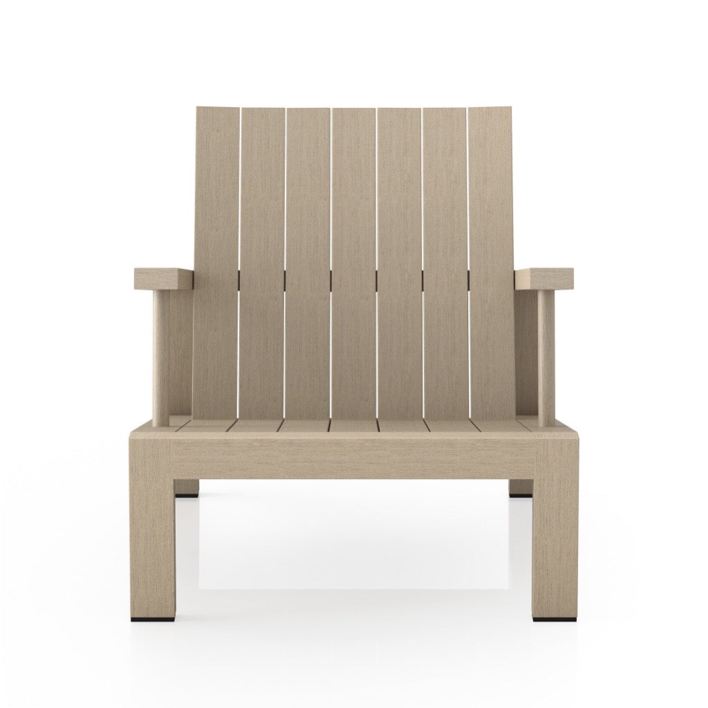 A modern take on the traditional Adirondack chair. Solid FSC-certified teak forms a wide angled base and frame detailed with sharp, linear lines. Cover or store indoors during inclement weather and when not in use.