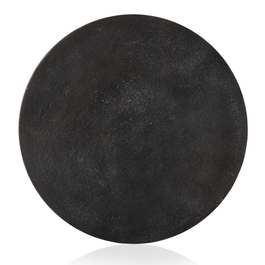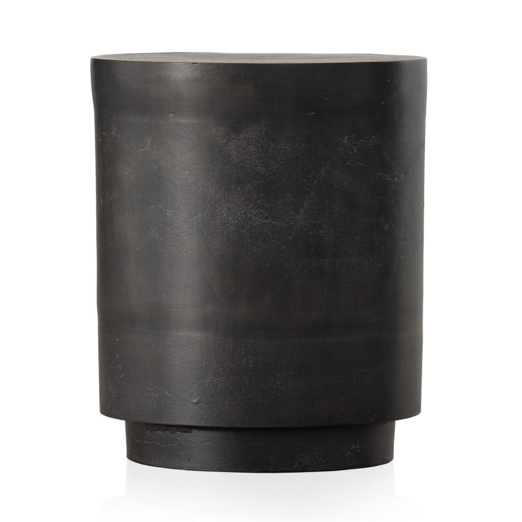 A simple drum shape end table crafted of cast aluminum atop a plinth. Natural texture and pitting from the molding process to be expected and contributes to the unique character of each item. Style indoors or out. Cover or store indoors during inclement weather and when not in use.
