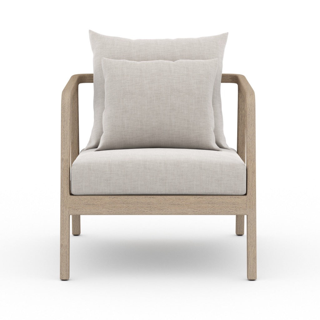Gently shaped teak creates a light and airy frame that contrasts perfectly with plush cushioning and thick woven rope detailing. Solid FSC-certifed teak frame with UV-resistant, water-repellent fabric on all cushions. Cover or store indoors and when not in use.