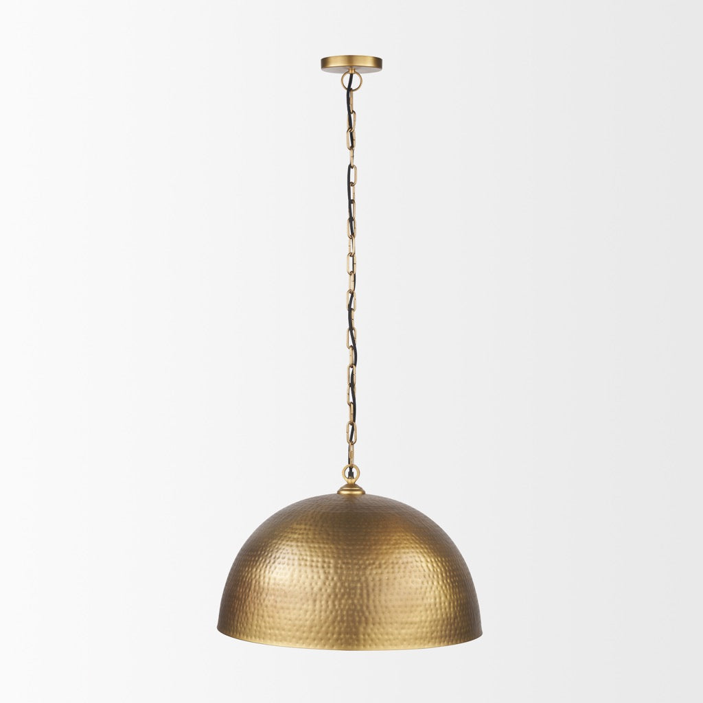 A beautiful domed pendant light that features a hammered exterior with an antique brass finish