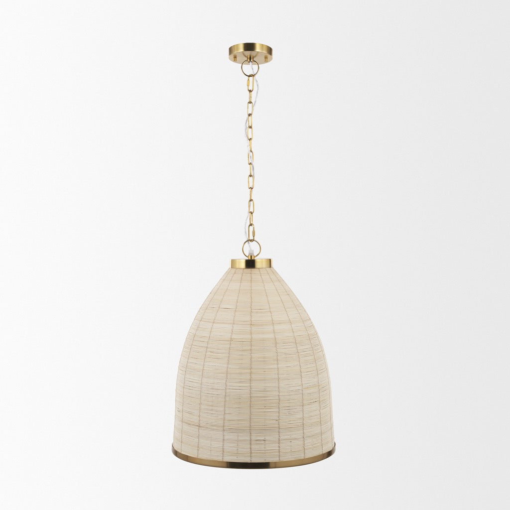 Saliha is a one-light pendant featuring a handwoven natural cane shade supported by a brass-finished metal cage and chain.