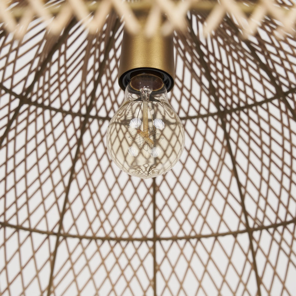 - Materials: Woven rattan shade tied into a gold-finished metal frame, with a matching adjustable chain. Maximum overall hanging height is 84".