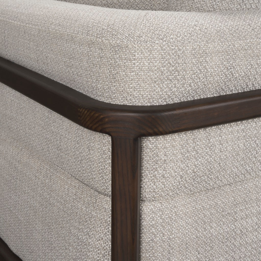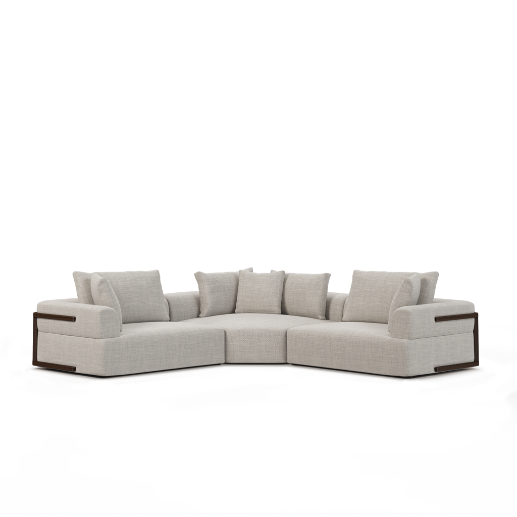 The Warner 3 Piece Sofa is upholstered in premium grey performance fabric, featuring a dark brown ash wood frame that elegantly cradles its side.