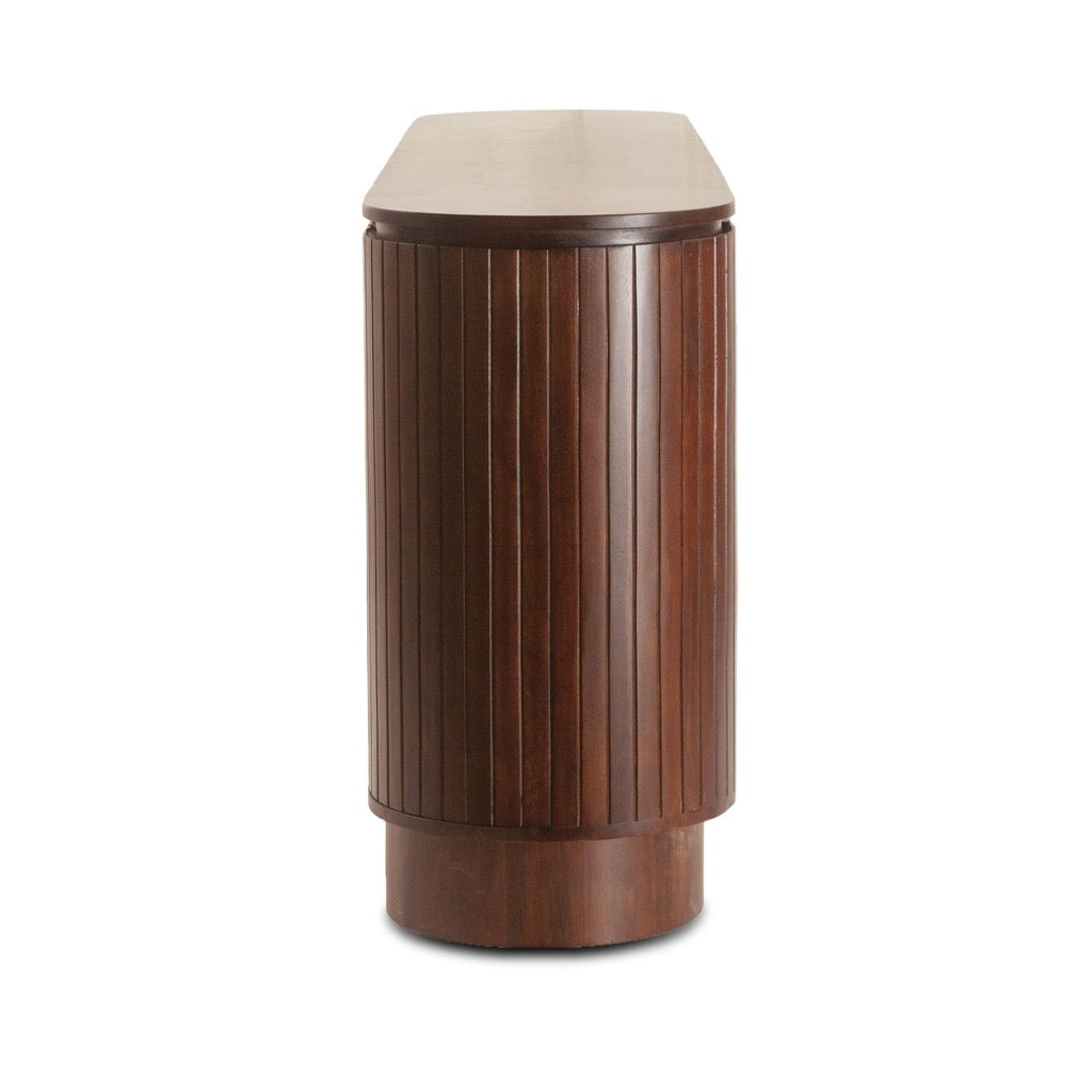 The Athena Sideboard features an elegant aged mahogany finish with distinctive fluted exterior details. Its refined design and spacious storage make it a stylish and functional addition to any dining room or living space, blending timeless charm with a touch of modern sophistication.