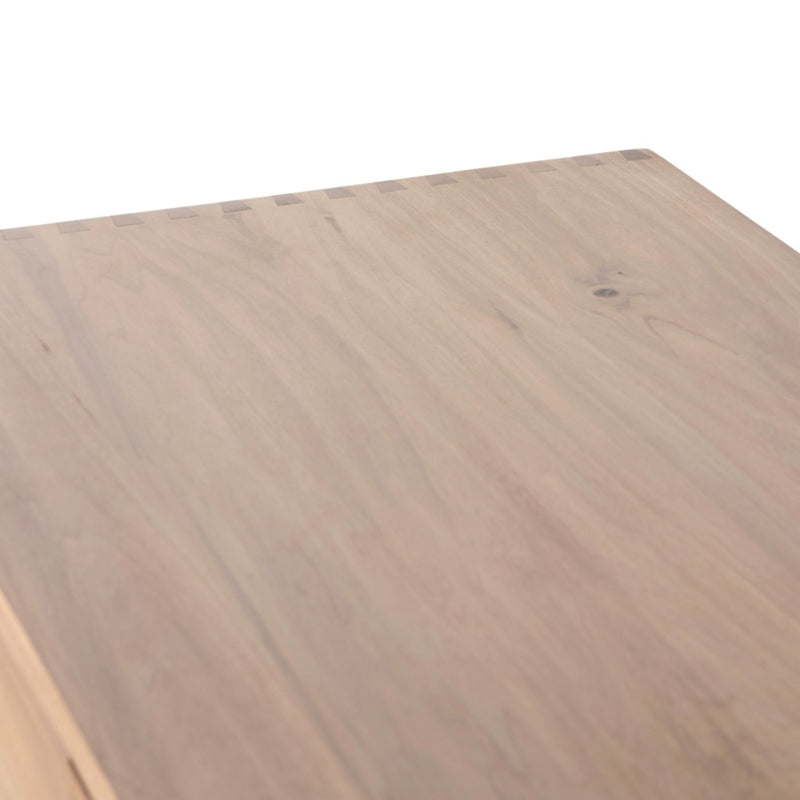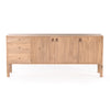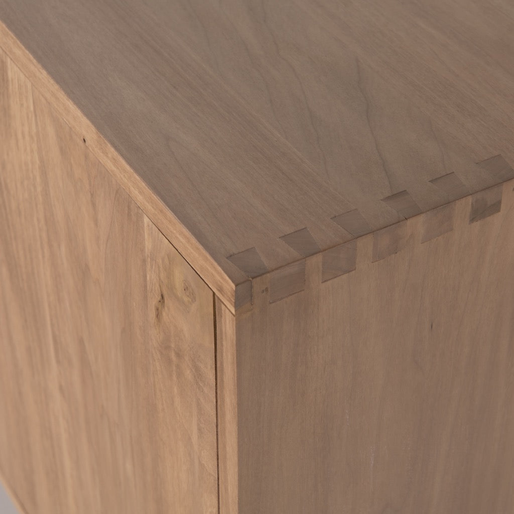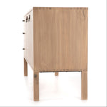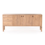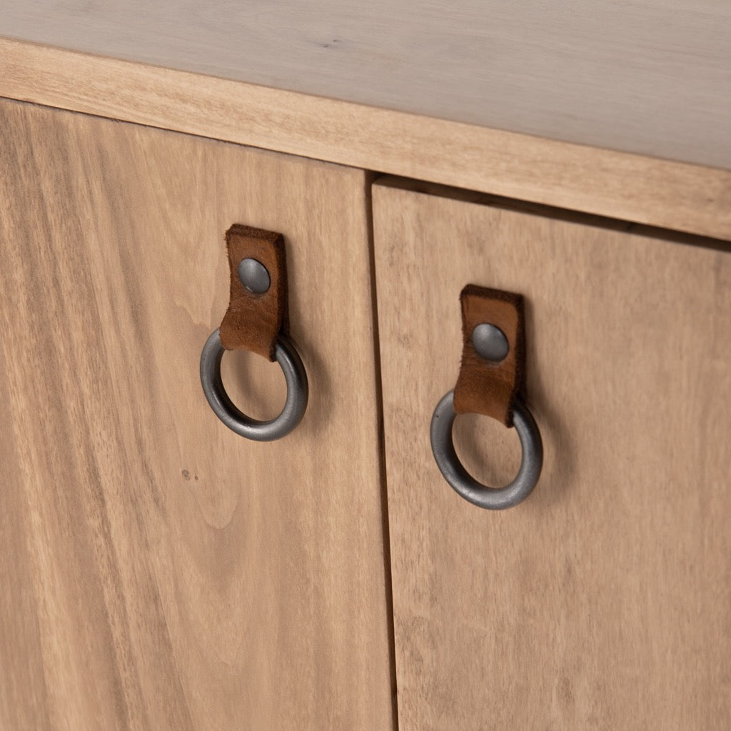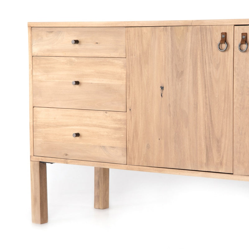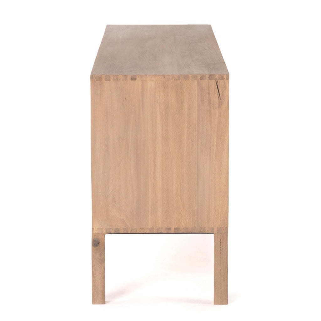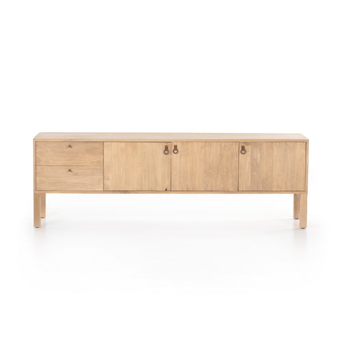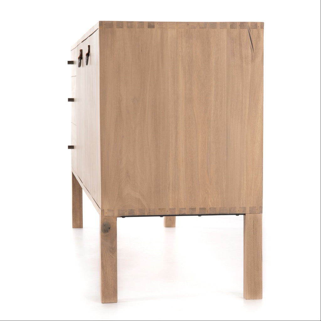 Beautifully simple in spirit. Solid dry-washed poplar forms a clean, Parsons-style sideboard with faux dovetail joinery plus iron and leather hardware, for a fresh, material-driven update to Shaker-inspired styling. Rear cutouts for cord management.