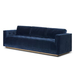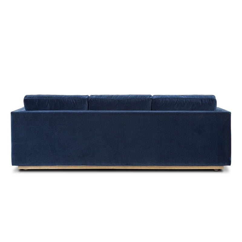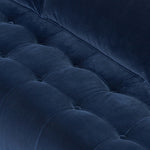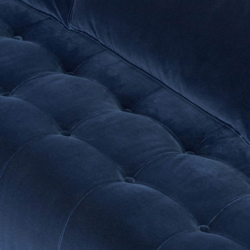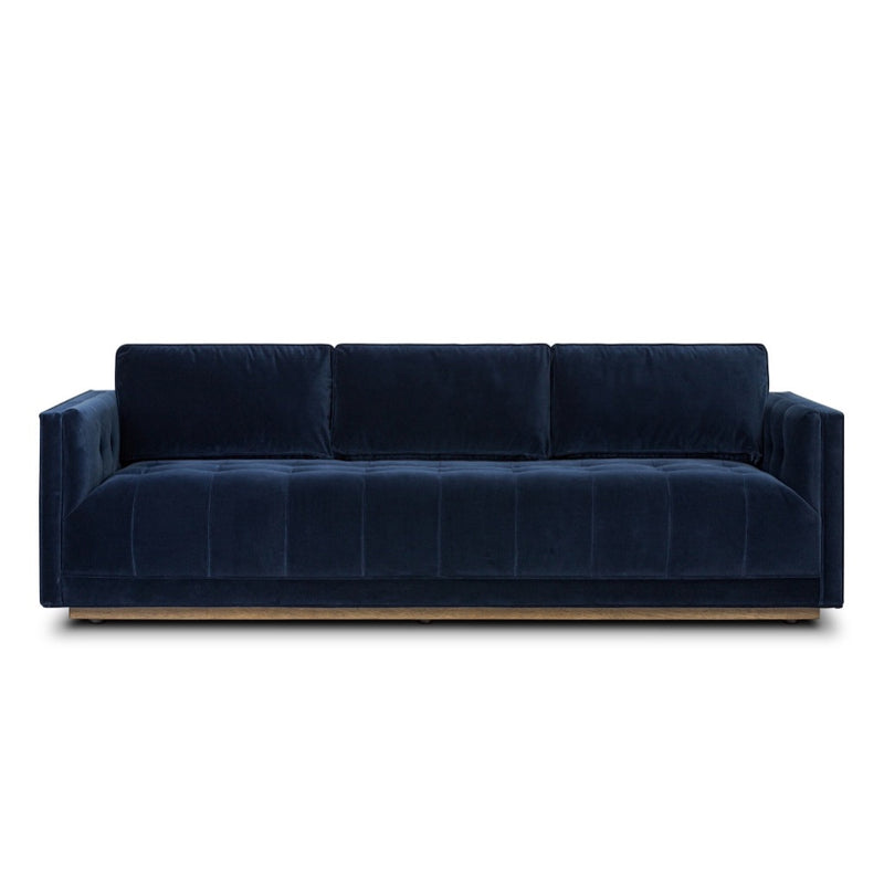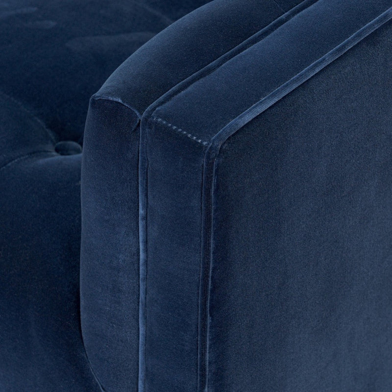 A subtle plinth parawood base supports Surrey Midnight upholstered seating, spurring the perfect fusion of comfort and sophistication with button-tufted seating and armrests.