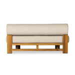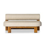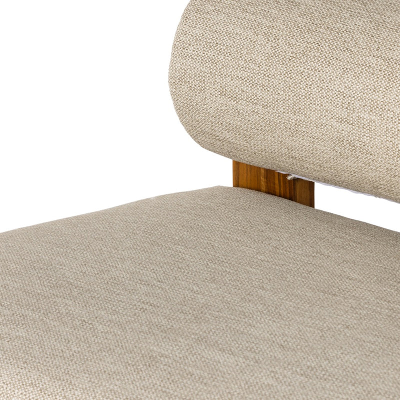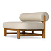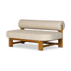 Sculptural rounded cushioning softens the linear, asymmetrical frame of this outdoor statement seating, perfect for apartment living. Solid 100% FSC®-certified teak frame. Cushioning is covered in 100% olefin, known for its UV-resistant, water-repellent and quick-drying abilities. Cover or store indoors during inclement weather and when not in use.