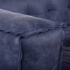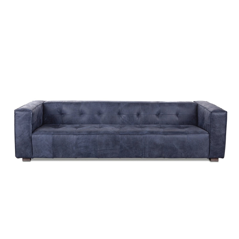 Solid wood framing along with high density foam cushions and heavy gauge steel springs ensures longevity and a high level of comfort. The leather of the cushions has a soft, luxurious feel, while the exposed trim seams lend an air of unique vintage-retro style. The sofa has four block legs in weathered brown finish to complement the Italian blue color of the leather upholstery.