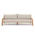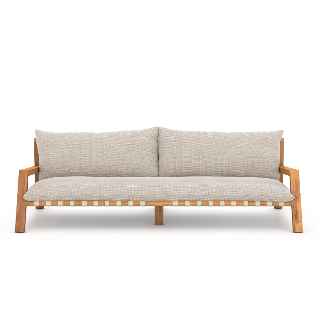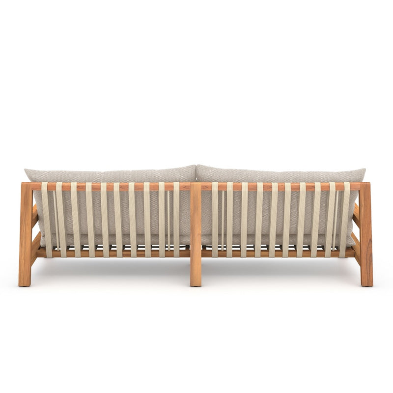 Bring sophistication to the great outdoors. Clean, wide framing of FSC-certified teak splays for angular intrigue, with sand-colored seating and ivory strap detailing. Cover or store indoors during inclement weather and when not in use.