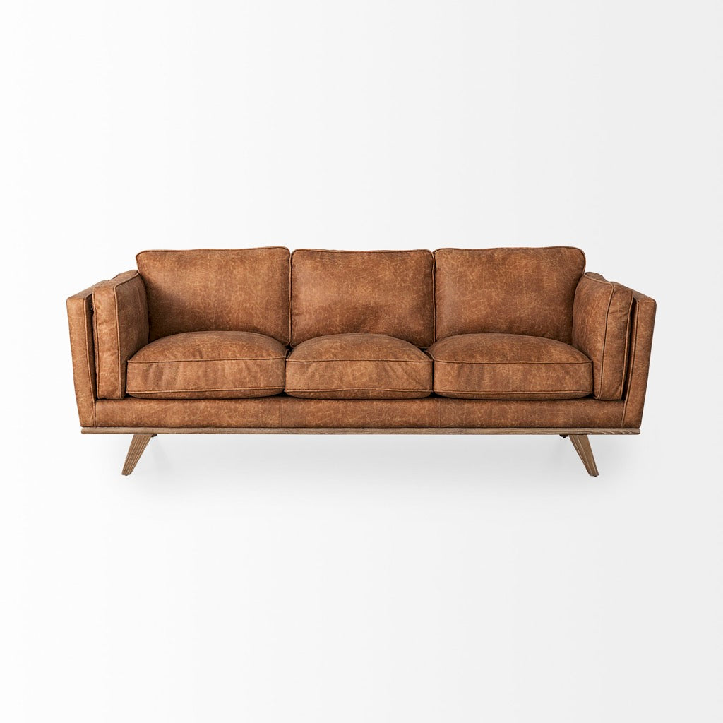 - Faux Leather Wrap: Brooks is wrapped in premium, faux cognac brown leather, and offers unparalleled comfort and is guaranteed to have you lounging for hours. The leather is finished in a deep cognac brown color with medium brown wooden legs.