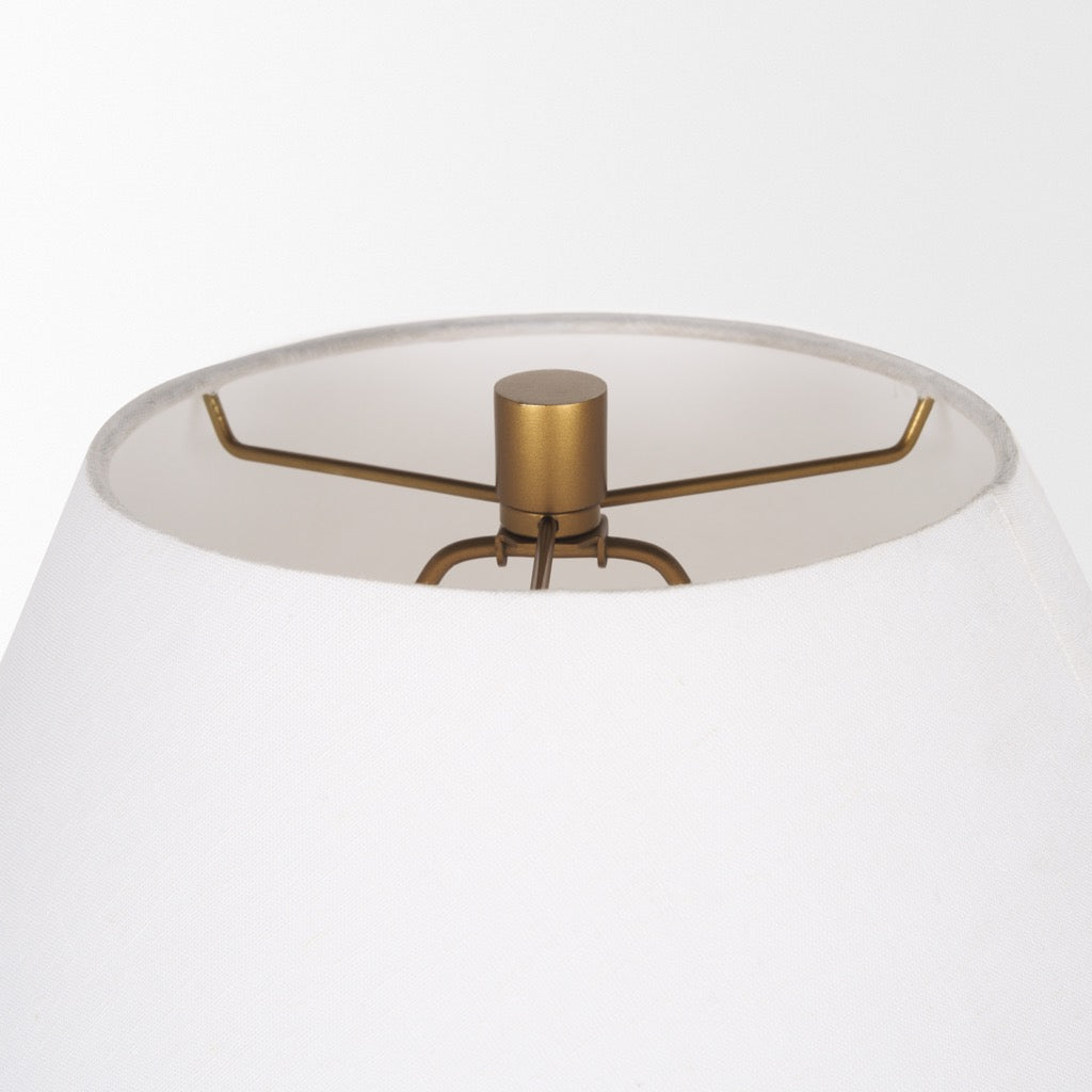 Salaah is a textured metal table lamp finished in an elegant antiqued gold and complemented with a cream fabric shade.