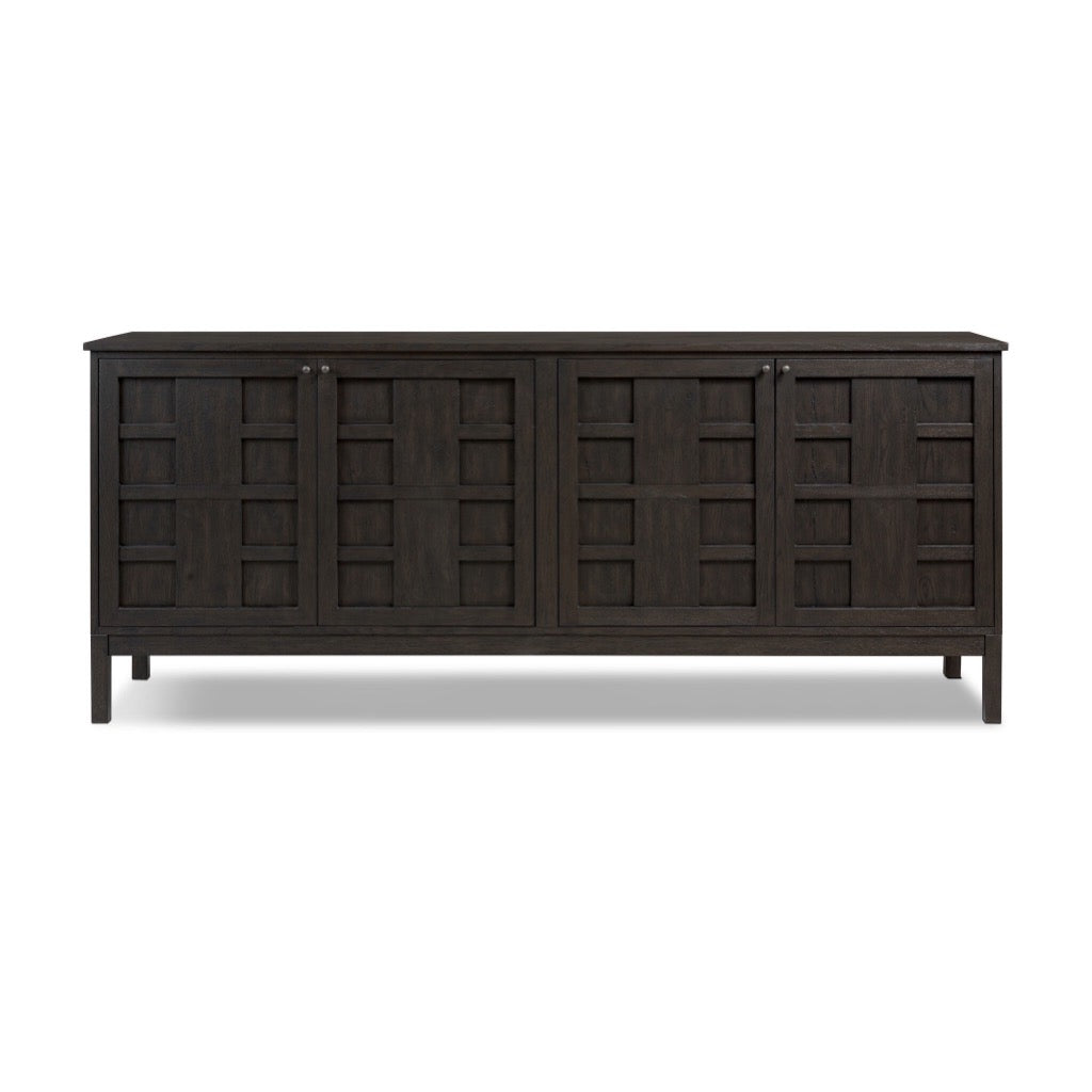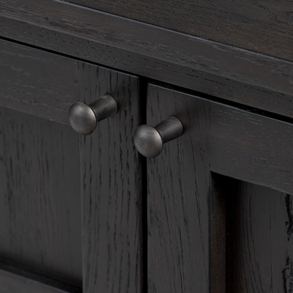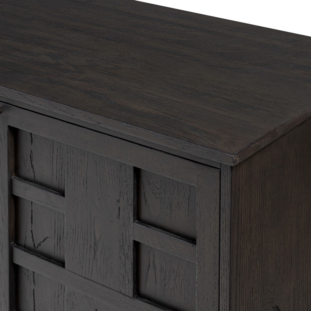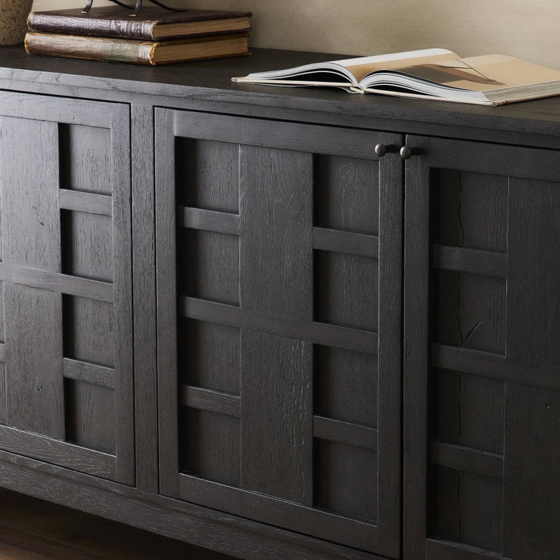 A transitional piece that works into your collection with ease. This solid oak sideboard is finished in a smoked black, highlighting natural wood cracks and graining inherent to rich character woods. Grid-like patterned doors bring dimension to clean, simple shaping, while interior shelving awaits storage of serveware, table linens and more. Pieces vary; knots and cracks are common and reflect the beautifully natural character of oak.