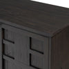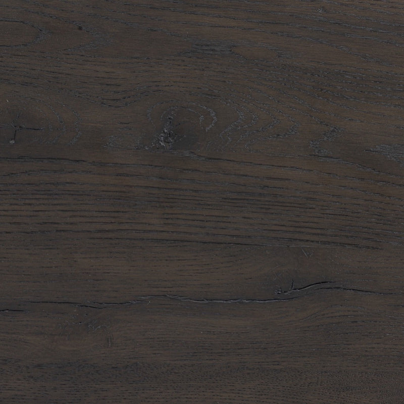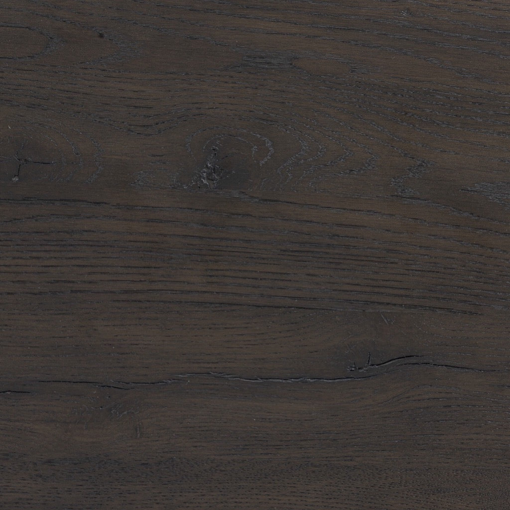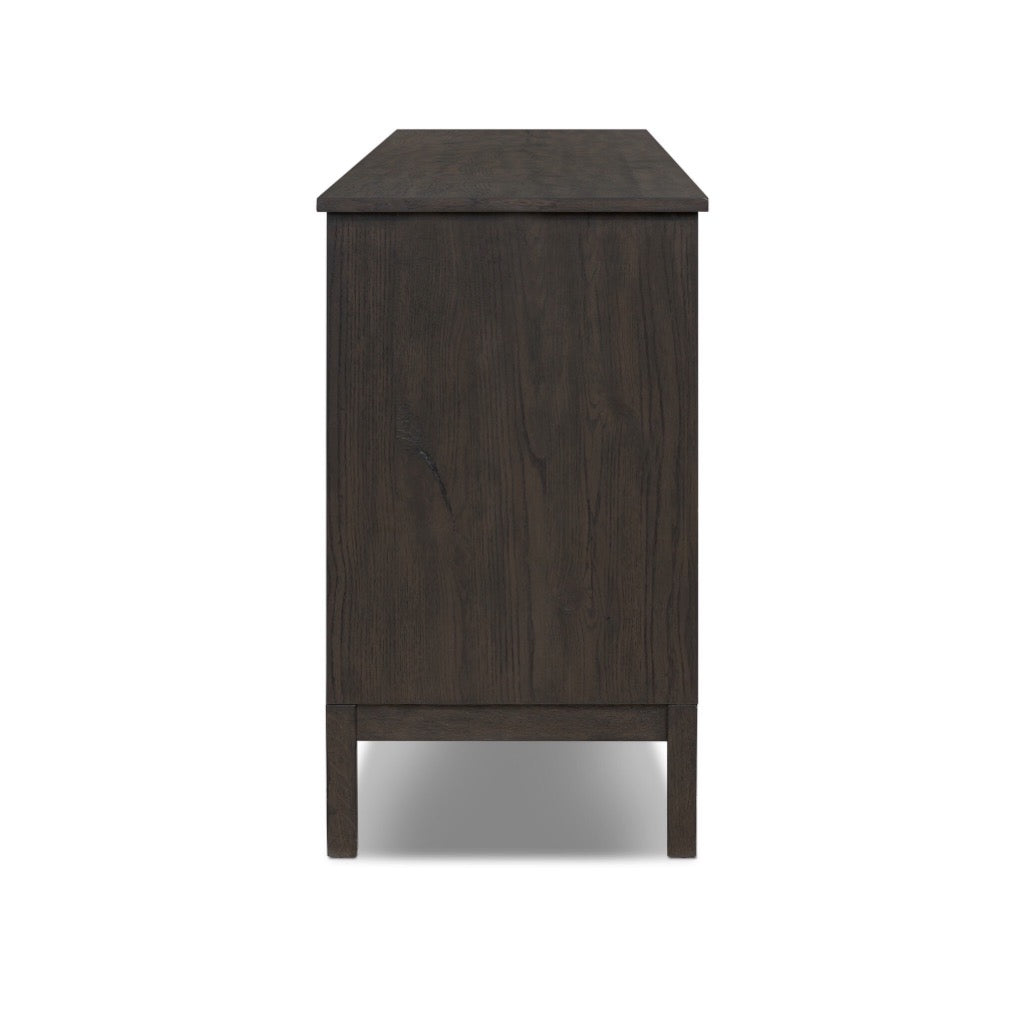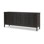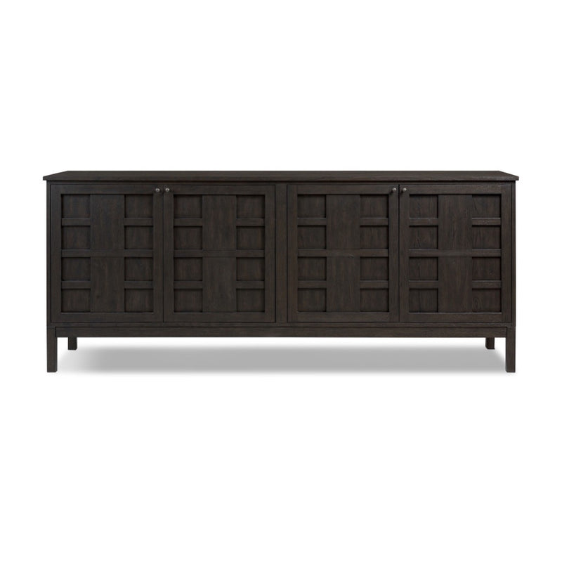 A transitional piece that works into your collection with ease. This solid oak sideboard is finished in a smoked black, highlighting natural wood cracks and graining inherent to rich character woods. Grid-like patterned doors bring dimension to clean, simple shaping, while interior shelving awaits storage of serveware, table linens and more. Pieces vary; knots and cracks are common and reflect the beautifully natural character of oak.