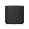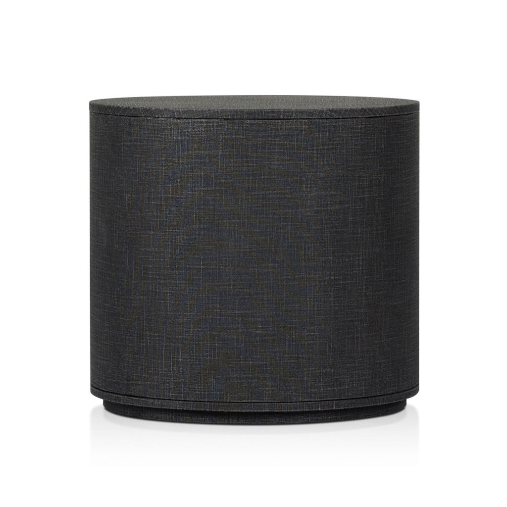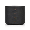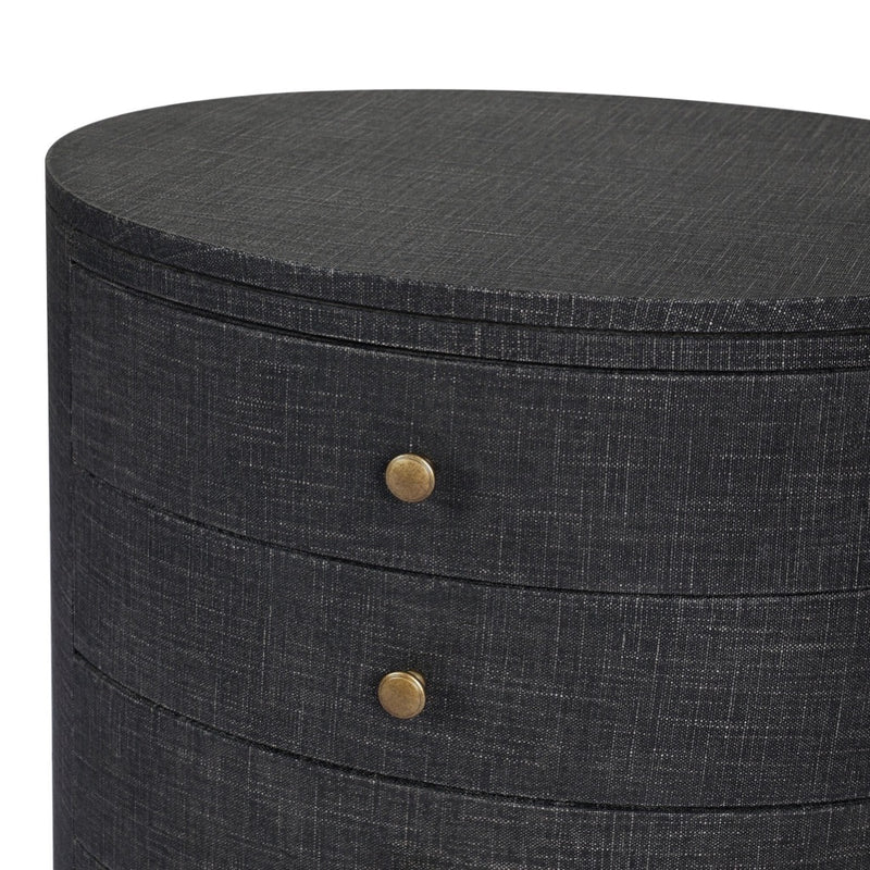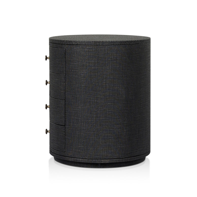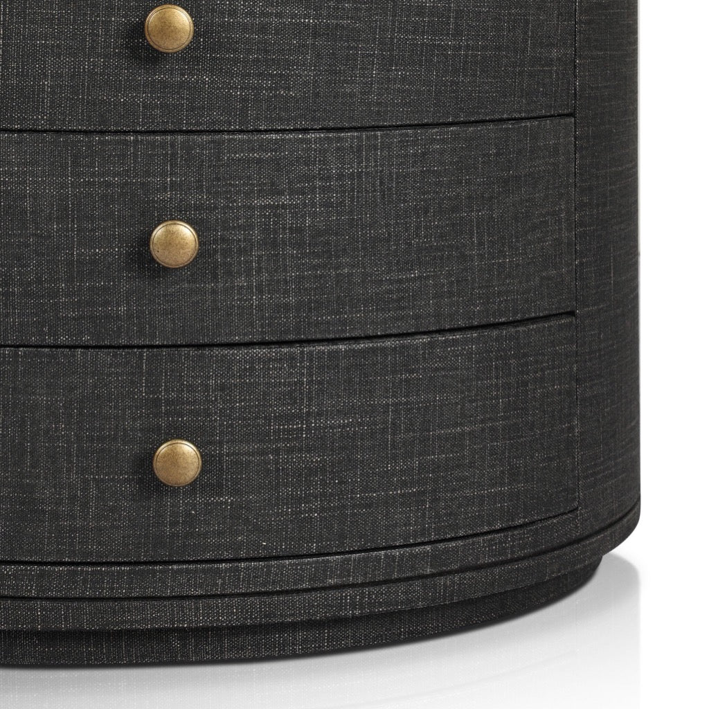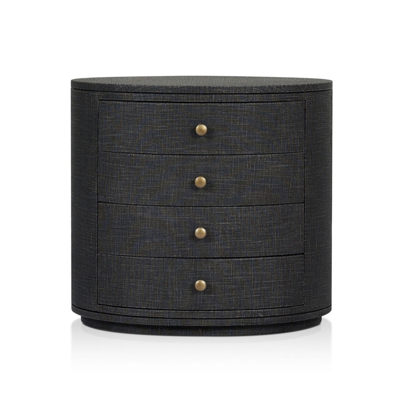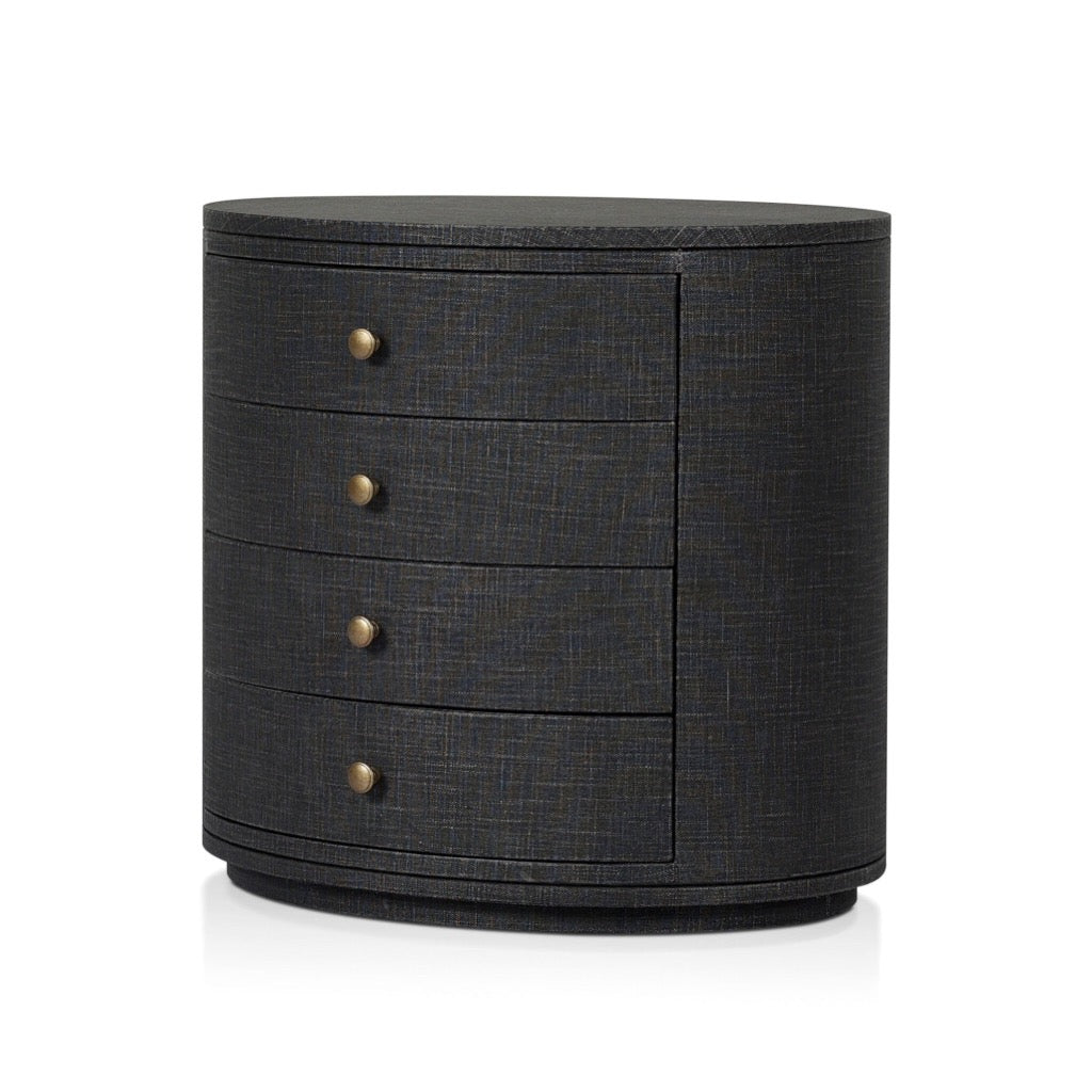 Uniquely made from black-painted linen, a beautifully curved nightstand shapes four drawers for generous bedside storage.