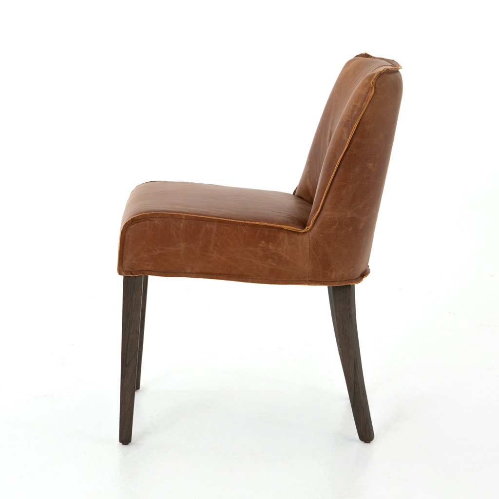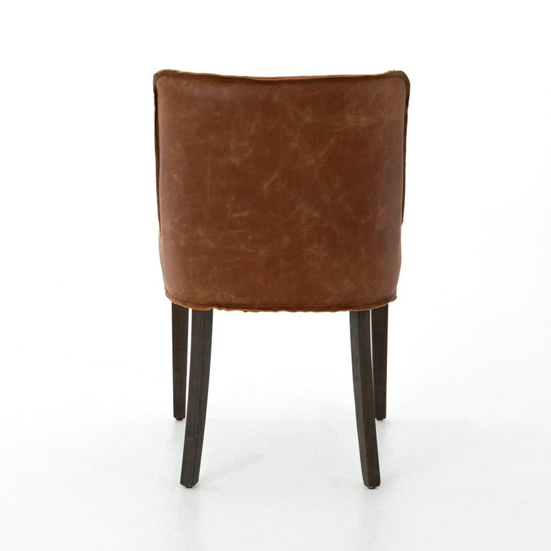 Raw-edged chestnut leather and distinctively flared read leg of cedar-finished nettle wood bring an urban-rustic aesthetic to the dining table.