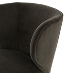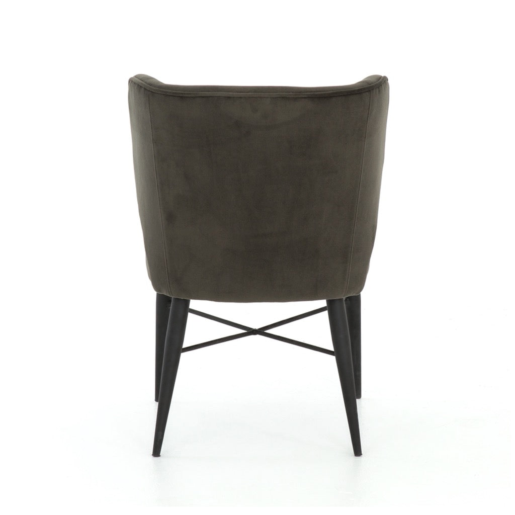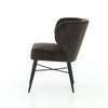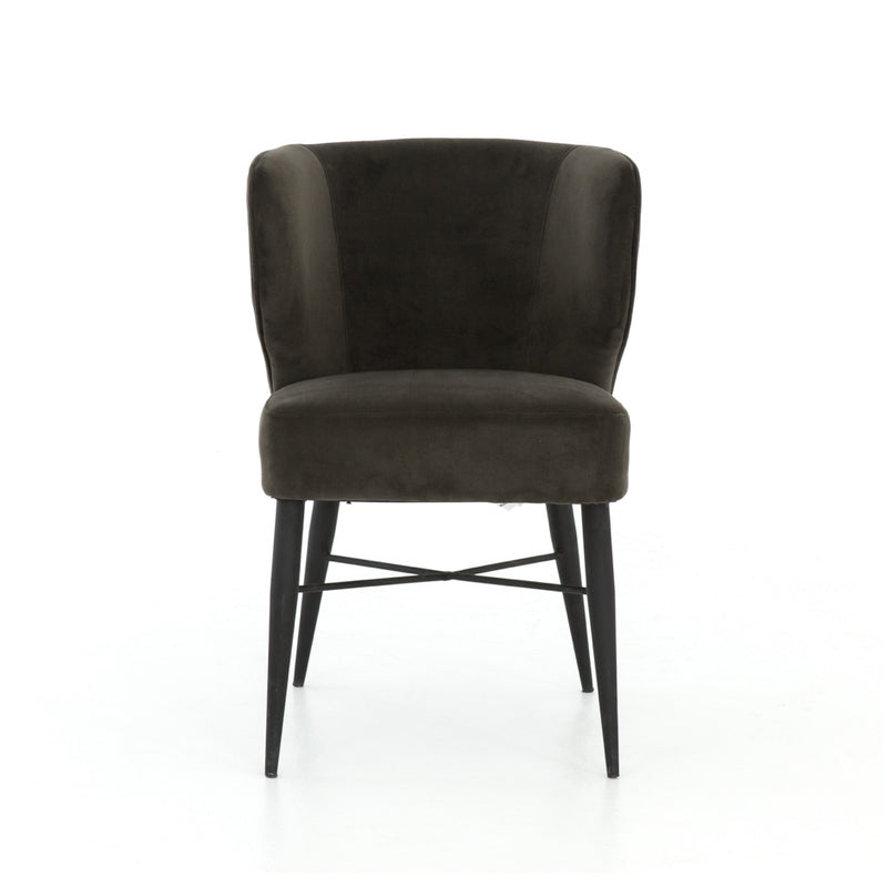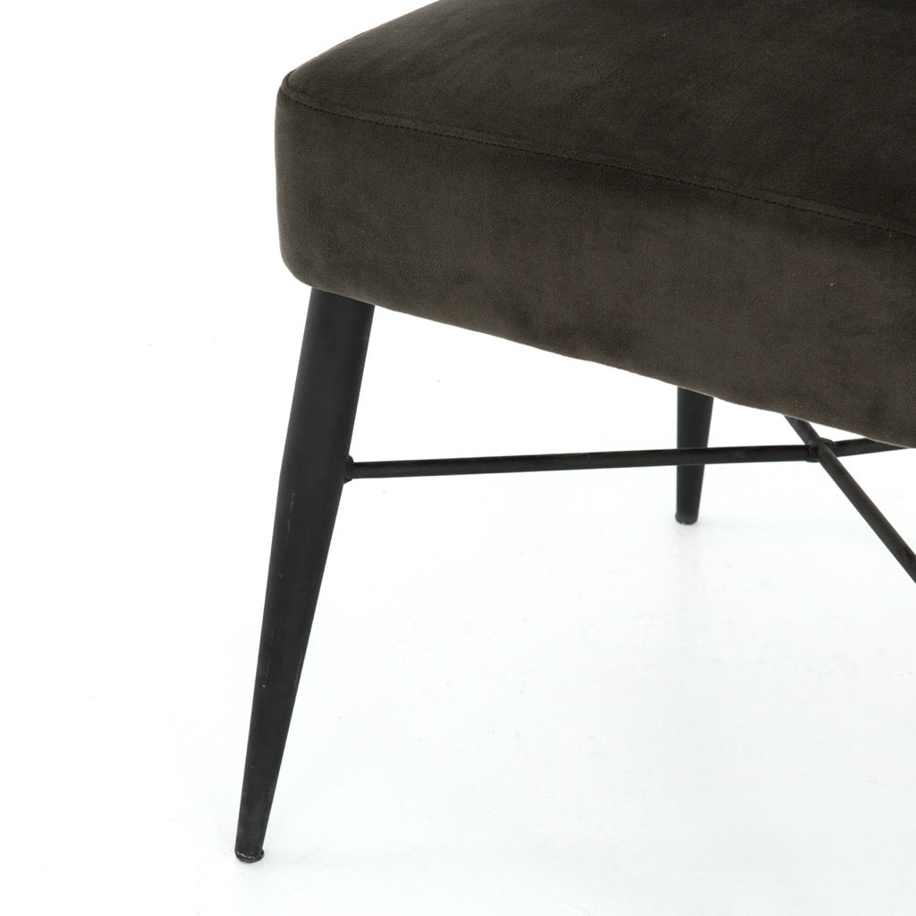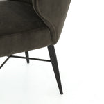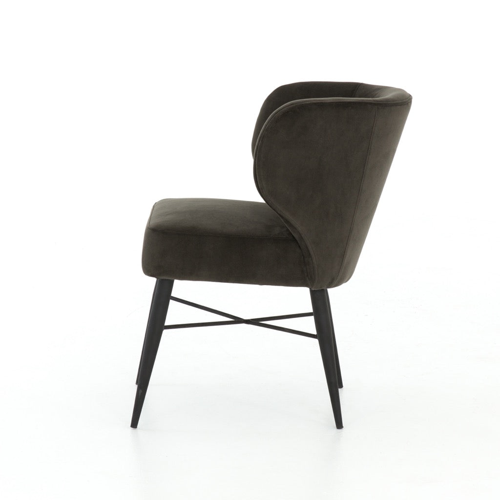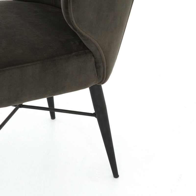 A low, curved back reimagines the classic wingback. Angular iron legs are cone-tapered, supporting snug-fit seating in an inviting smoke hue.