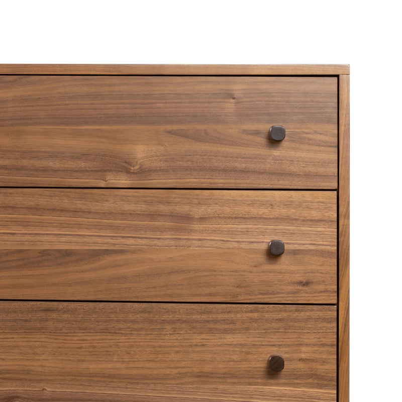Inspired by campaign-style furniture of the 1800s — packable pieces first designed for traveling military use — a simply shaped dresser of natural walnut features a subtly inset top and rounded legs, finished with wooden hardware. This item complies with the STURDY Act.