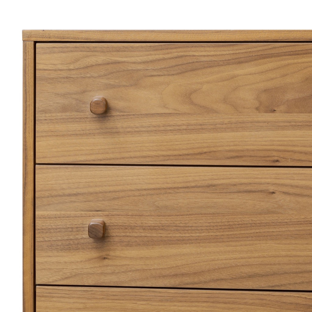 Inspired by campaign-style furniture of the 1800s — packable pieces first designed for traveling military use — a simply shaped dresser of natural walnut features a subtly inset top and rounded legs, finished with wooden hardware. This item has been modified to comply with the STURDY Act.