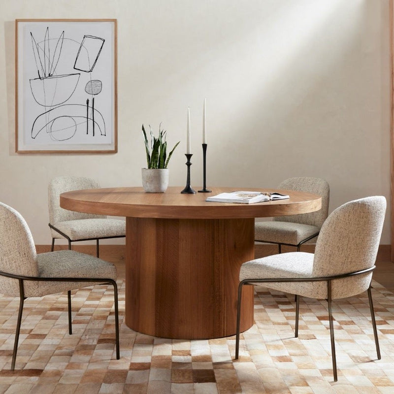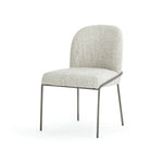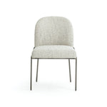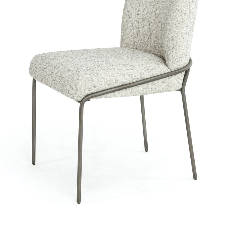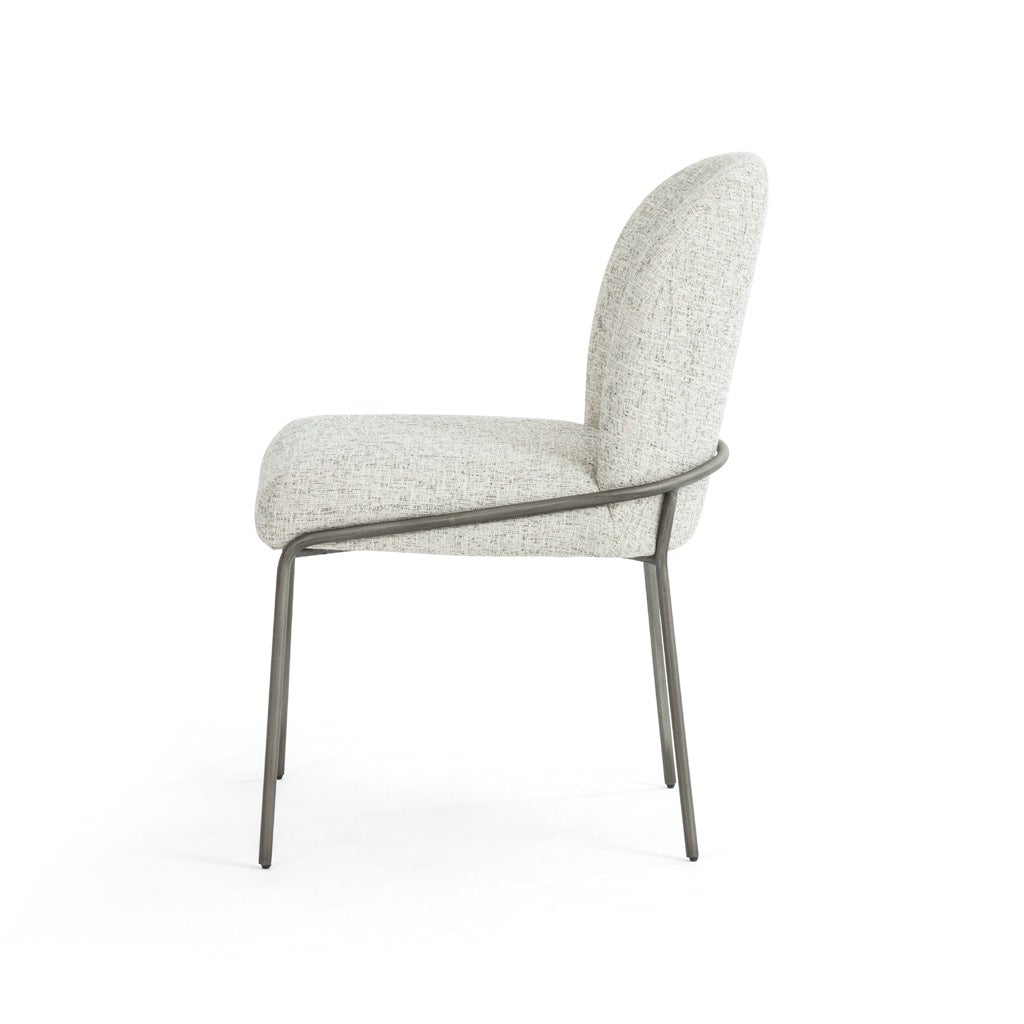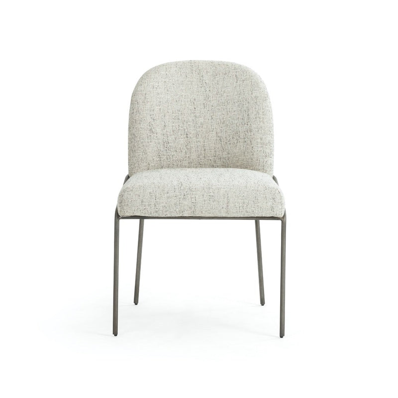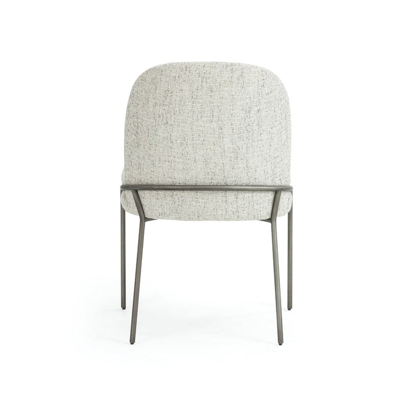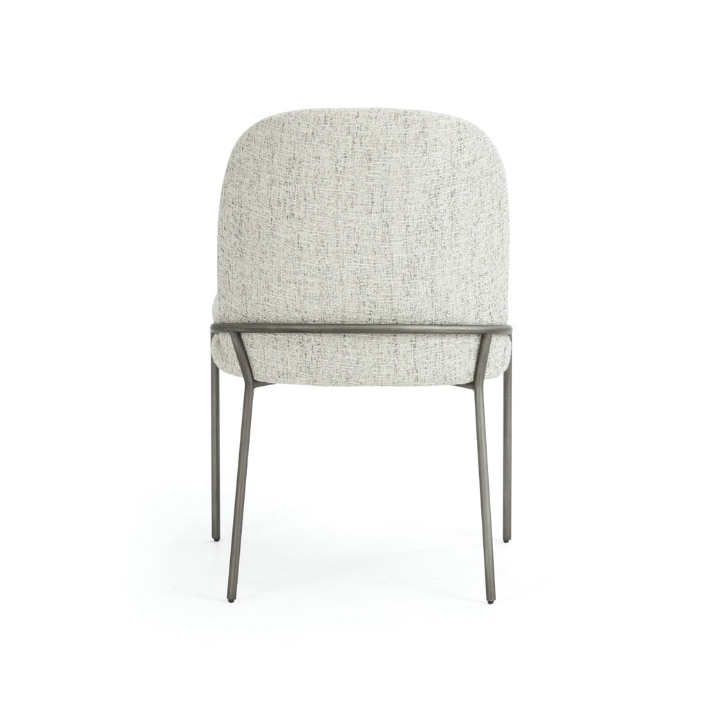 An Art Deco dream. Finely sculpted, scalloped-back dining chair of Four Hands-exclusive performance fabric pairs with slim, iron tube framing finished in a brushed slate, for a textural, fashion-forward feel with subtle feminine airs.