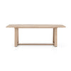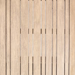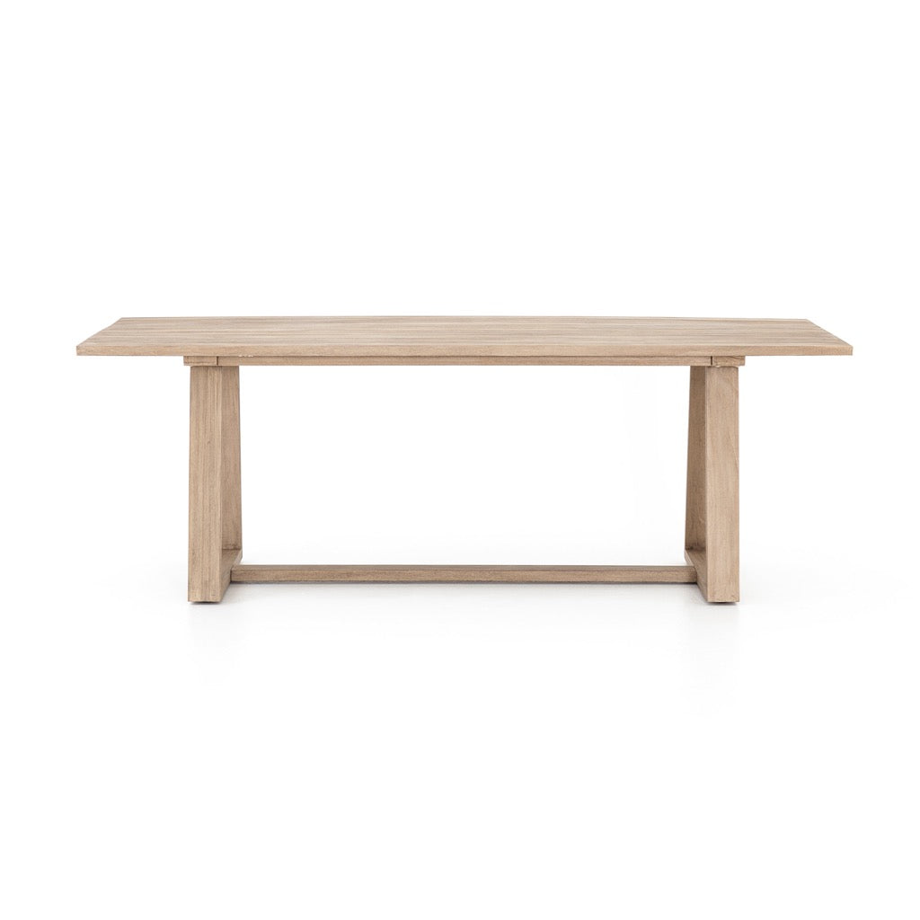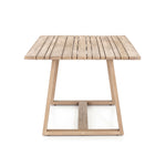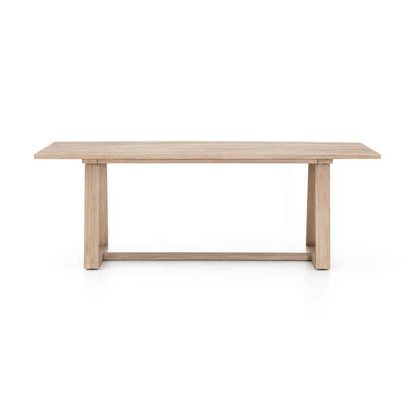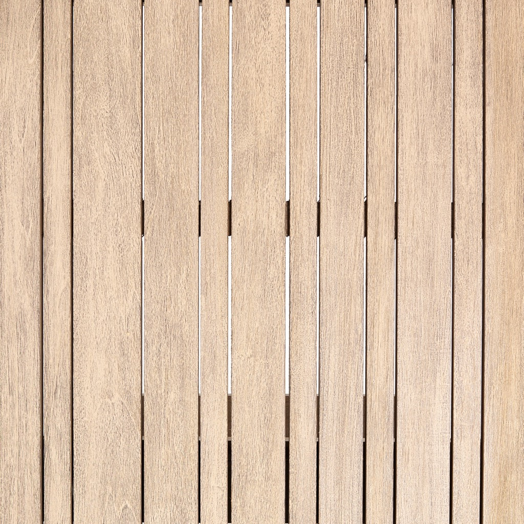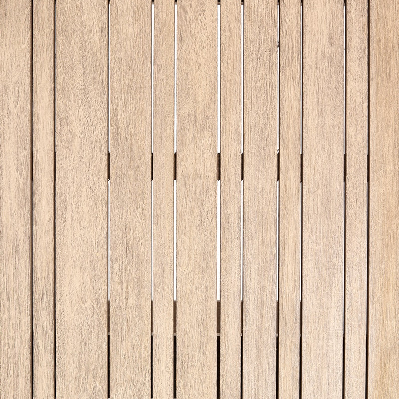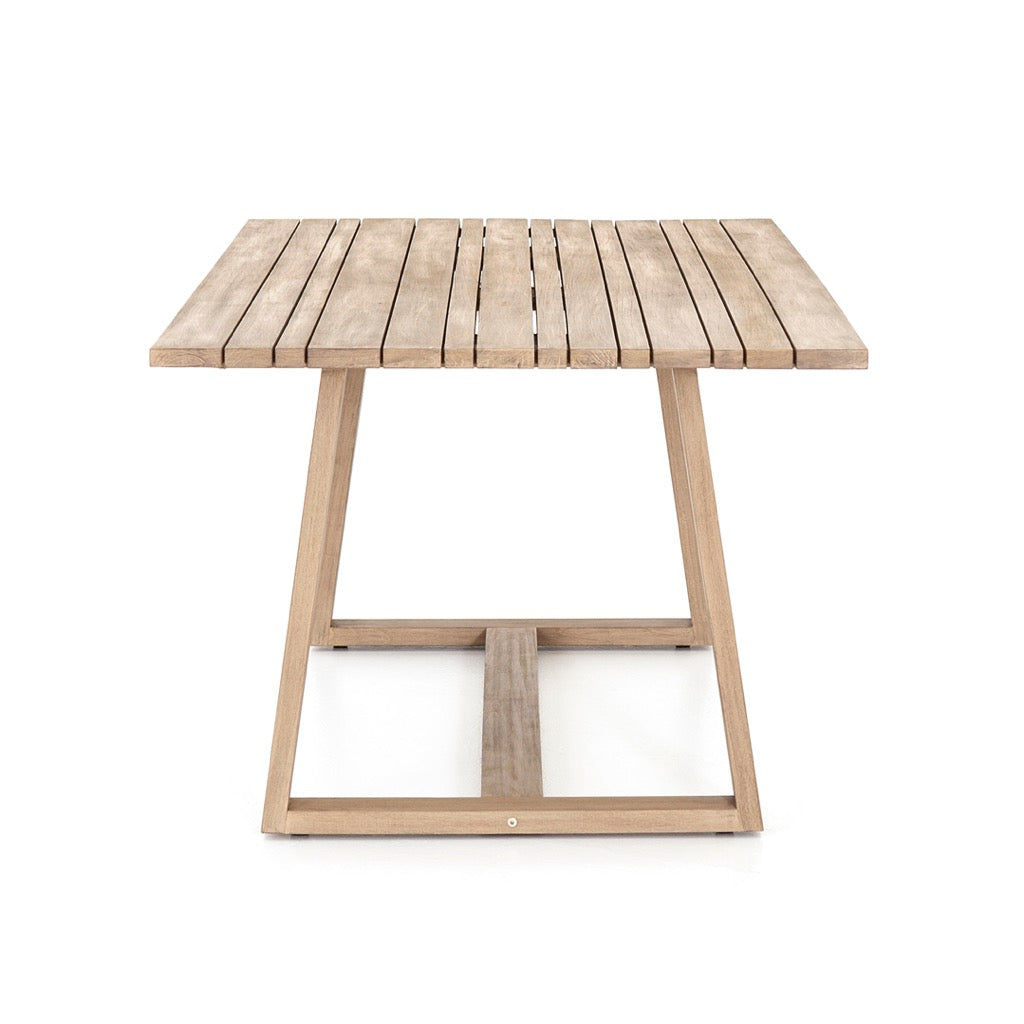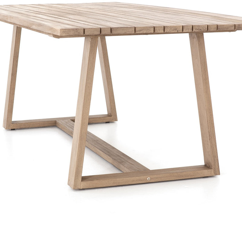 An angular base brings architectural appeal to the dining table. Planks of washed brown teak provide plenty of tablespace, perfect for outdoor entertaining. Cover or store indoors during inclement weather and when not in use.