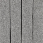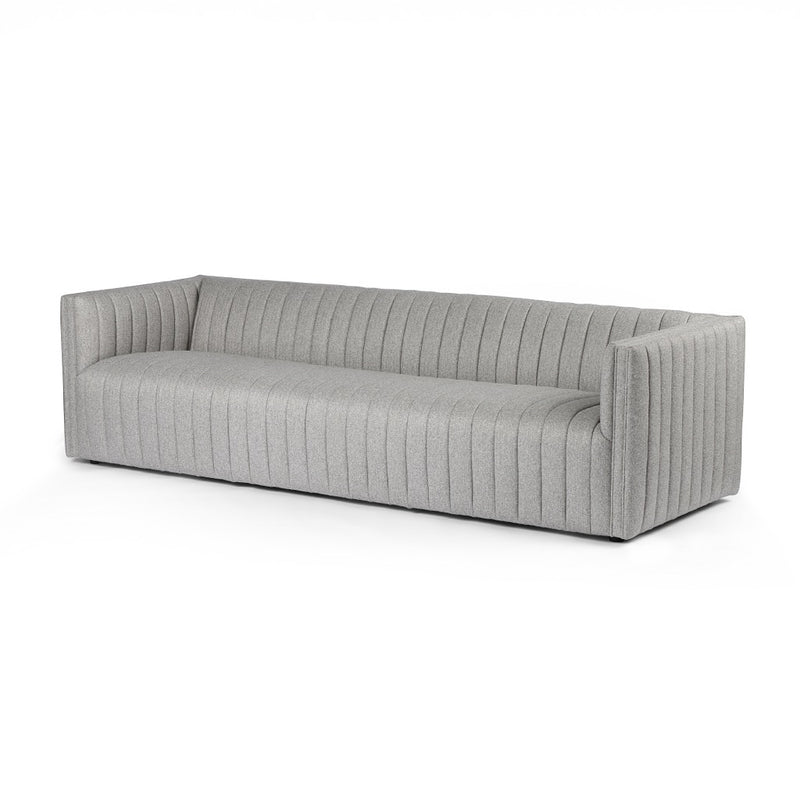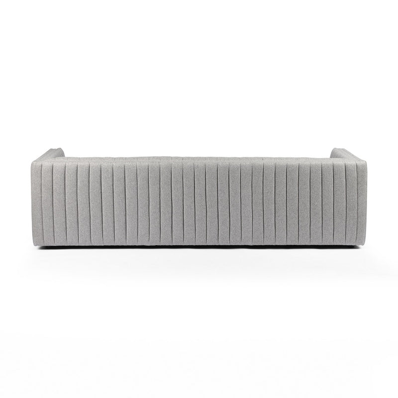 A dramatically channeled sofa with textural grey upholstery offers a clean look inspired by modern menswear.