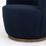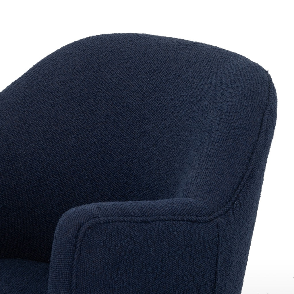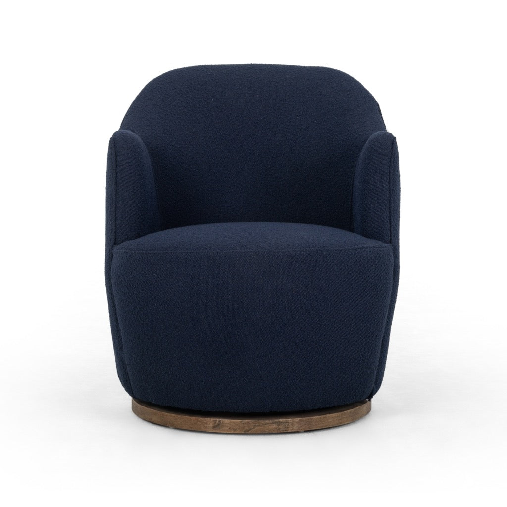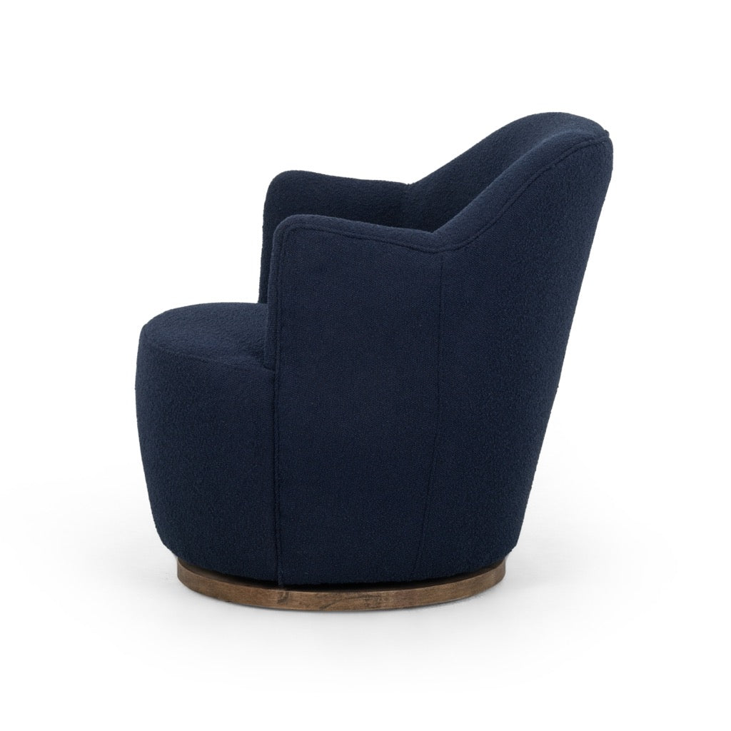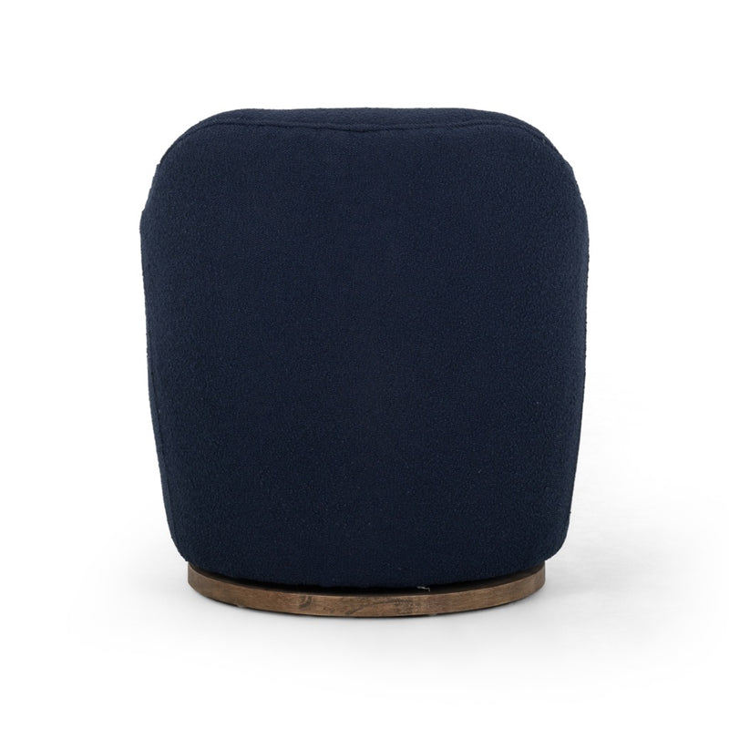 Intriguing and inviting. Drum-style seating is upholstered in a soothing and textural indigo bouclé. A swivel base of solid rubberwood places a fresh spin on a feminine form.