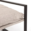 An innately hip design, modernized for outdoor use. Sling-style seating sits low and curved, with a removable cushion for cleaning ease. Bronze-finished aluminum framing adds an angular touch. Cover or store indoors during inclement weather and when not in use.