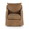 A fresh take on the classic swivel chair is small in scale and big in comfort. A Top Grain Leather slipcover meets high style with clever practicality.