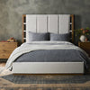 Take bedroom styling to new heights. Framed by a plinth-style base of burnished solid oak, light, linen-like upholstery creates a well-tailored headboard, with vertical channeling and unique strap detailing.