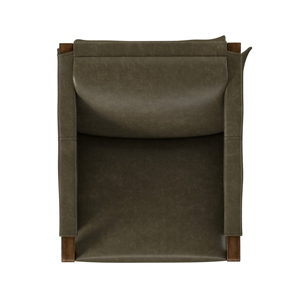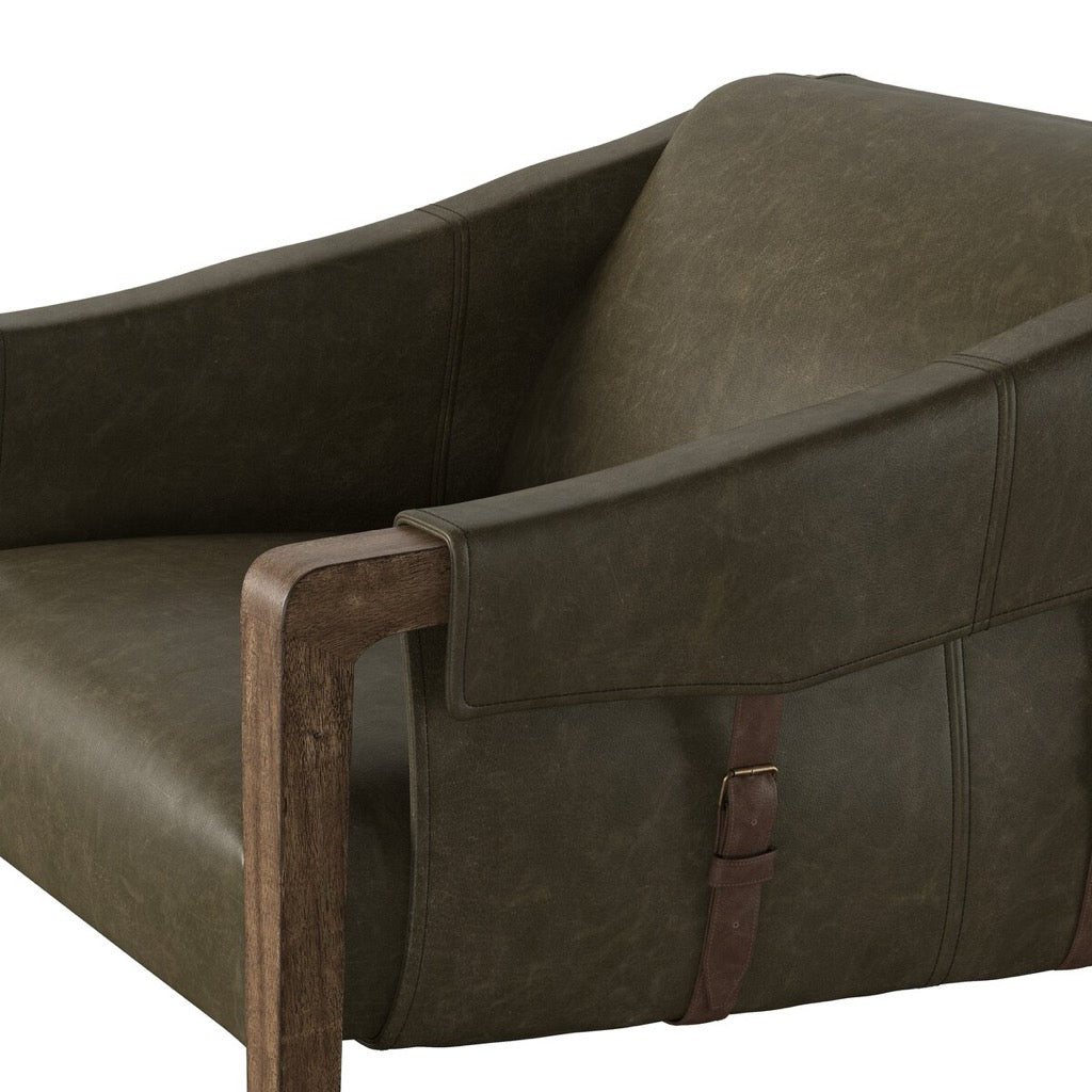 Lush seating of moss top-grain leather fastens to aged almond framing via trend-forward buckles. Angular arms honor midcentury design, adding a throwback feel to a cutting-edge look.