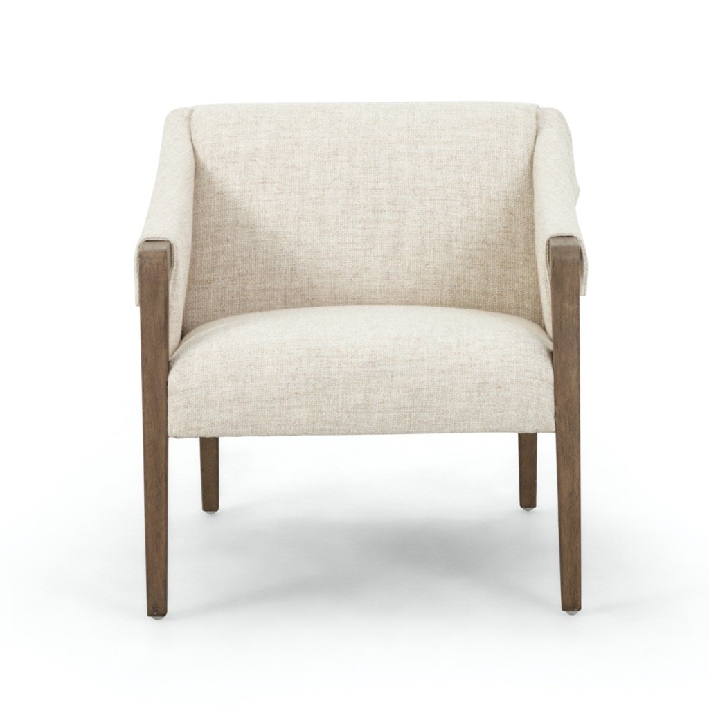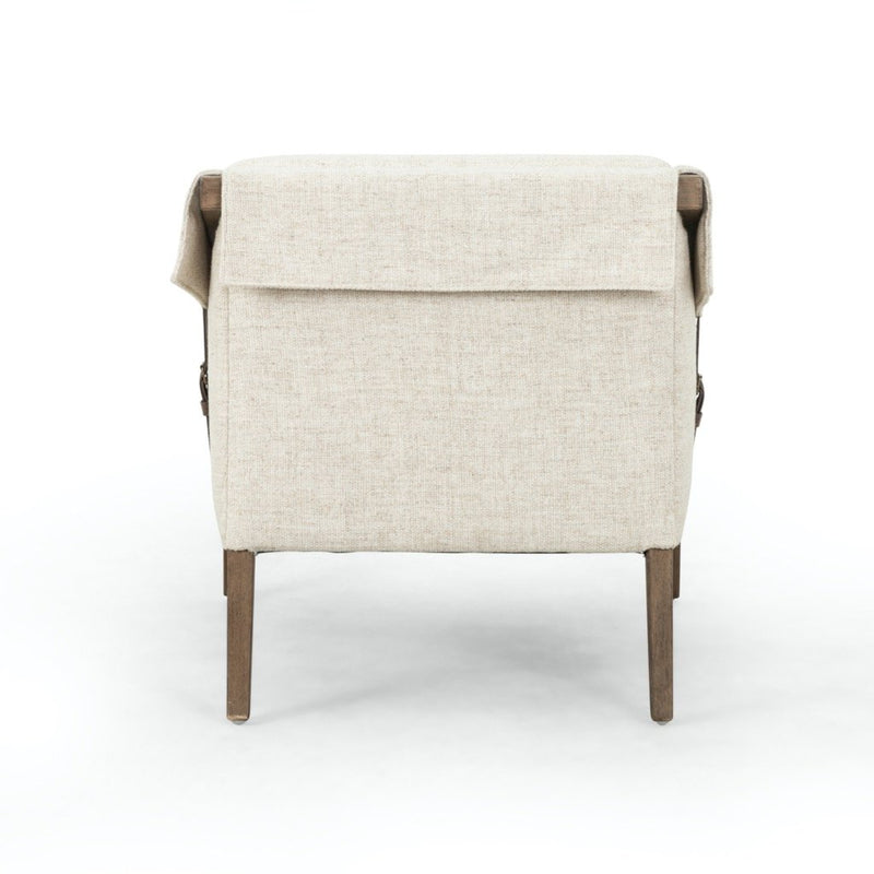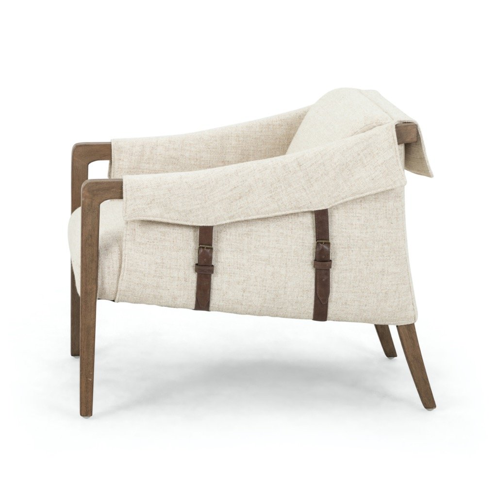 Cream-colored upholstery exclusive to Four Hands fastens to parawood framing by way of trend-forward buckles. Angular arms honor mid-century design, adding a throwback feel to a cutting-edge look.