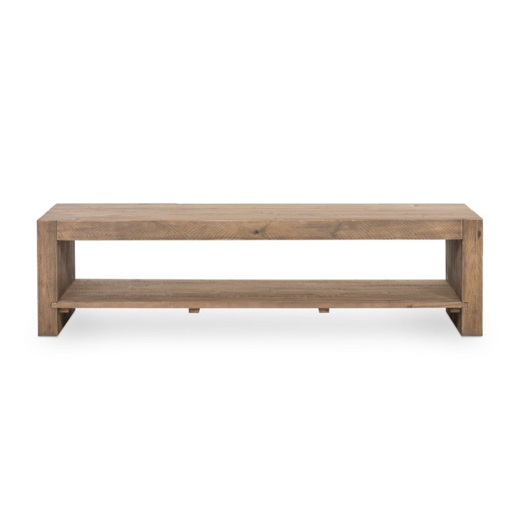 Reclaimed character woods are fashioned into the quintessential rustic coffee table. Lower shelving ups storage space, while materials' natural graining stays intact for authenticity.