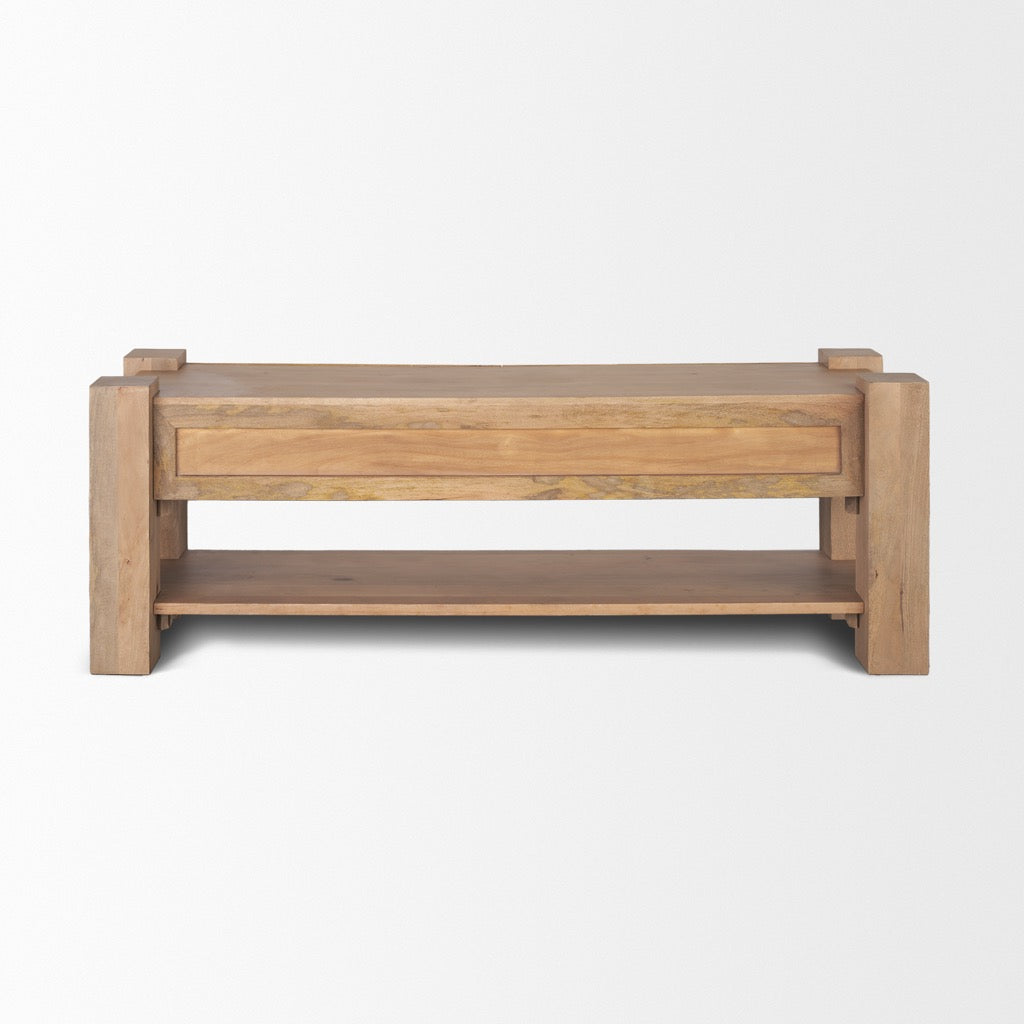 The Beth Media Console Table is made from solid mango wood in a light brown finish and features a rectangular top, two drawers, and bottom shelf all supported by four legs.