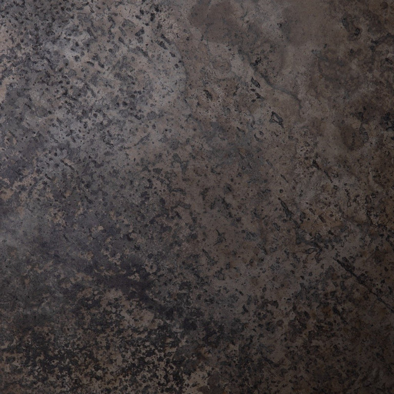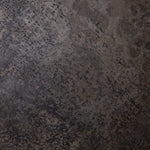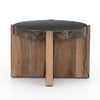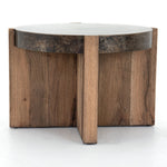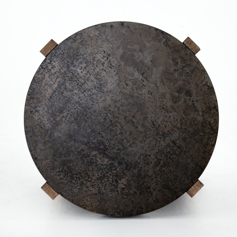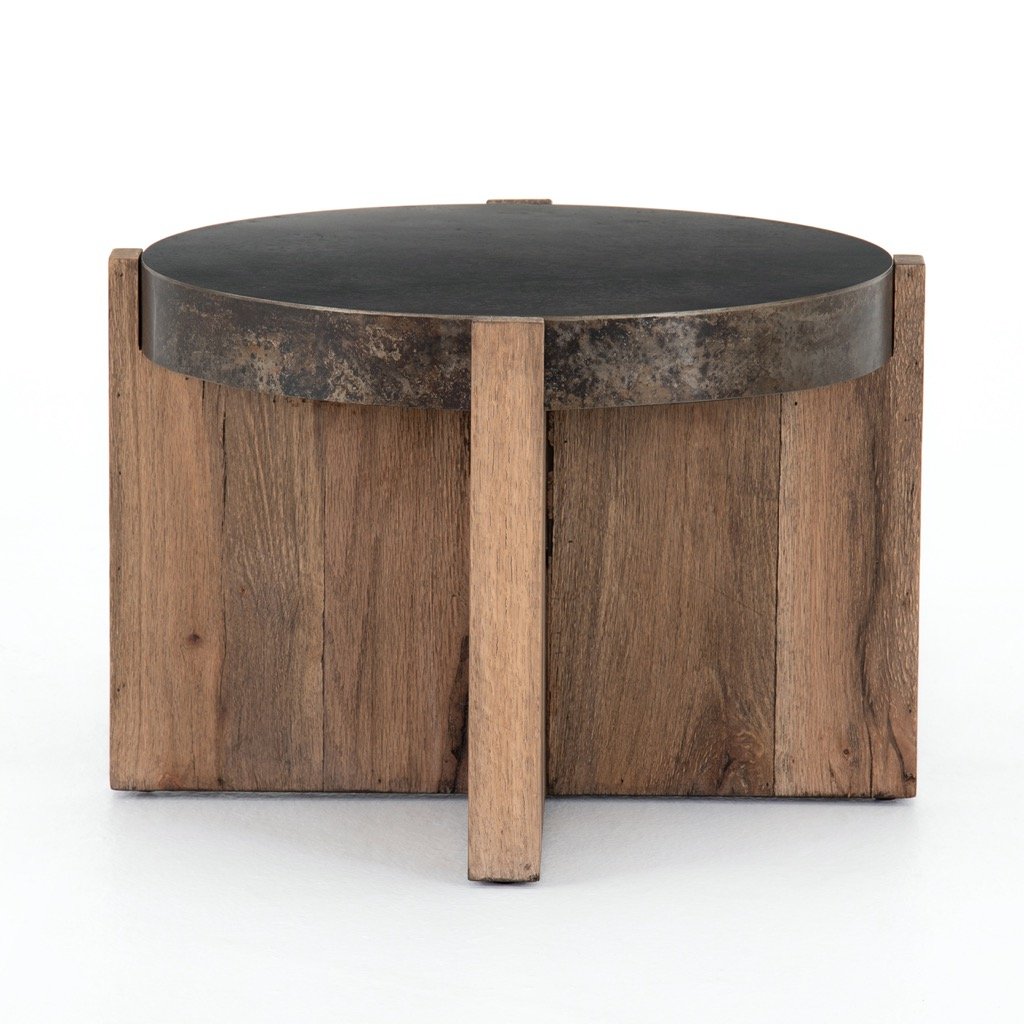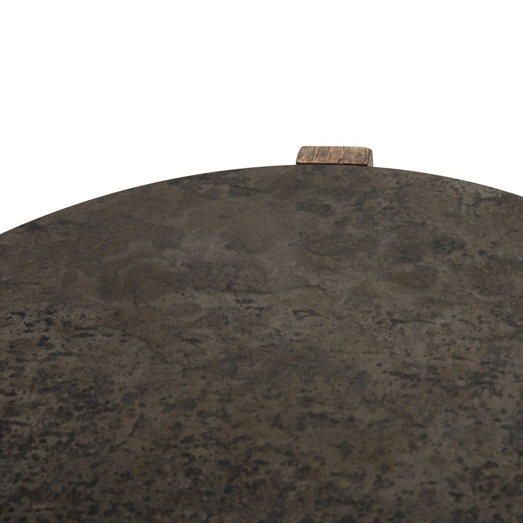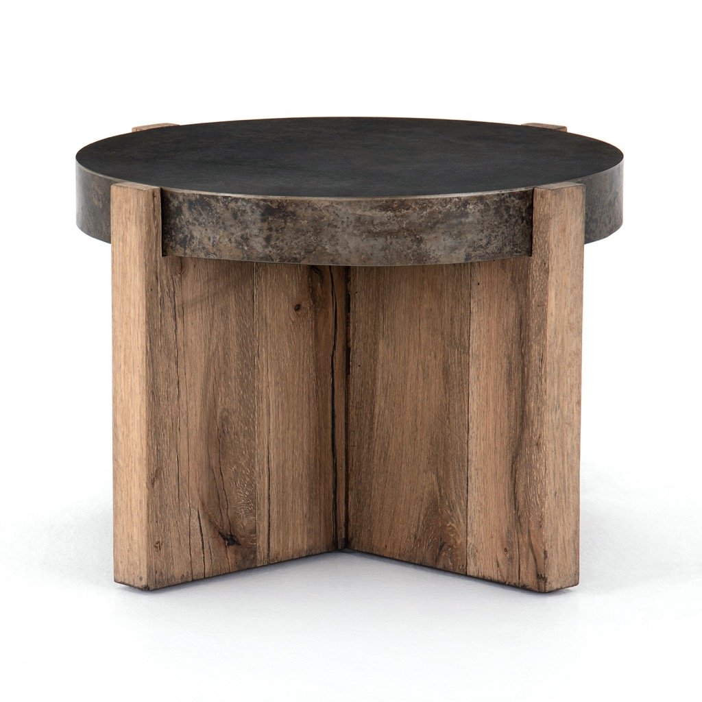 An organic-spirited statement piece. A round tabletop of distressed iron rests within a sculptural cradle base of rustic, character-rich oak with beautiful highs and lows.