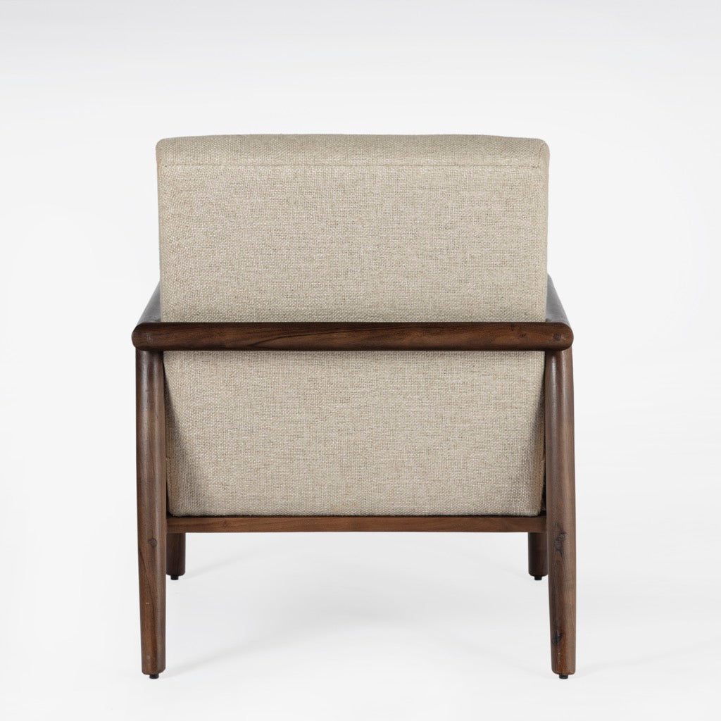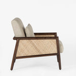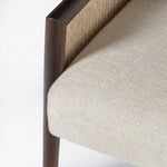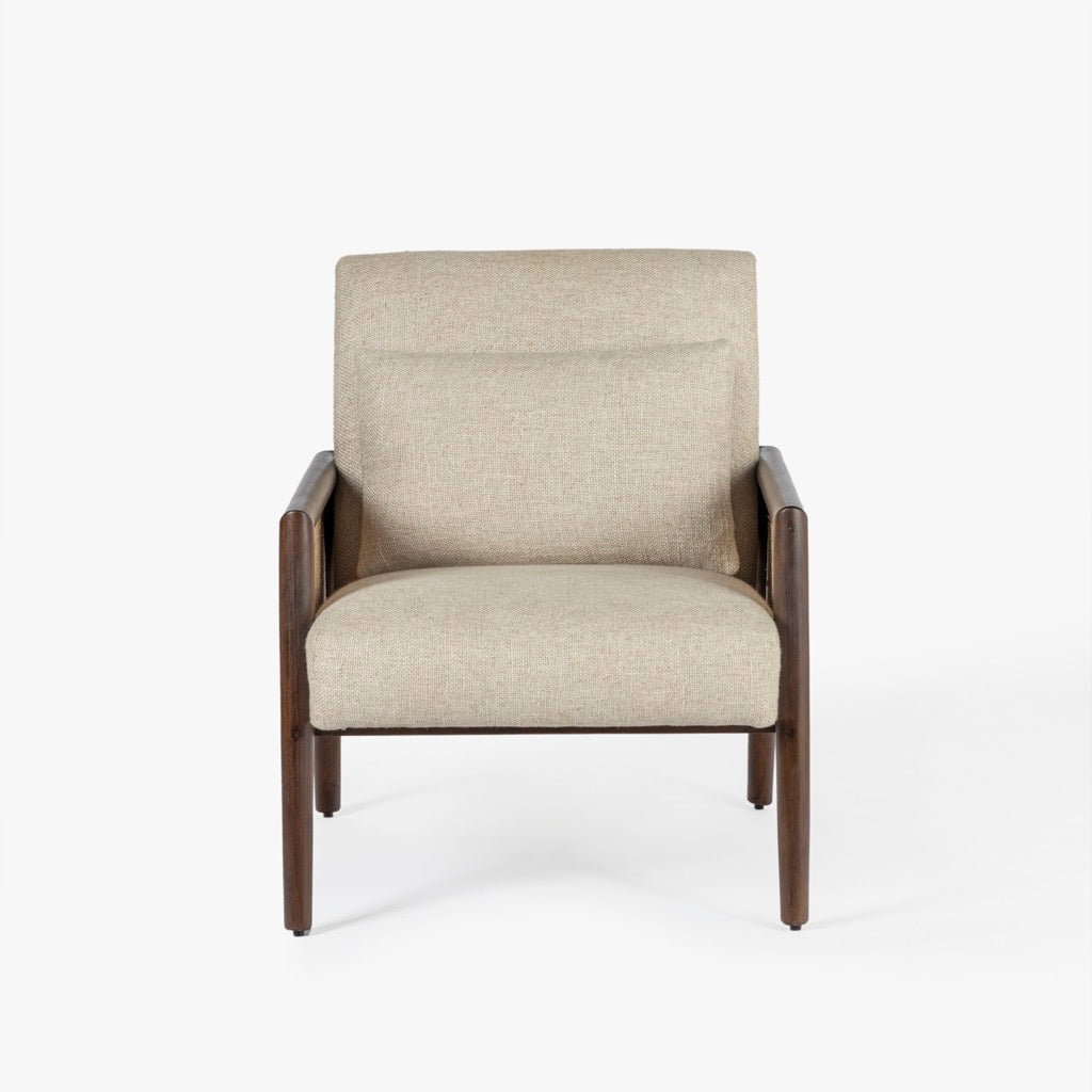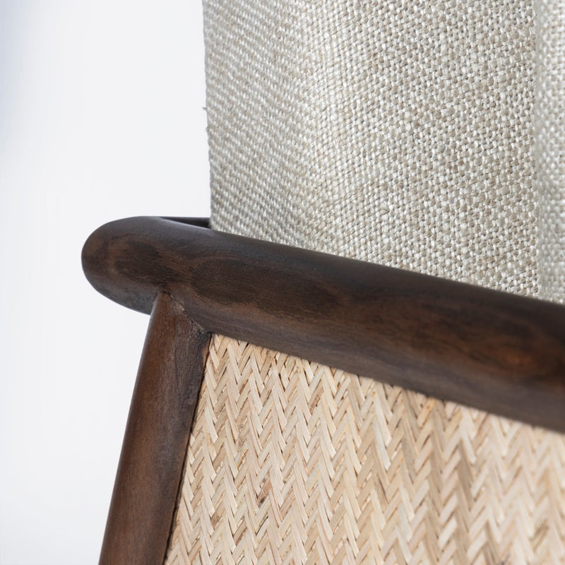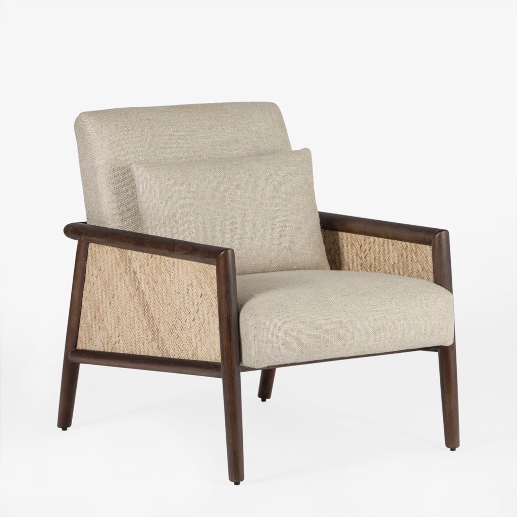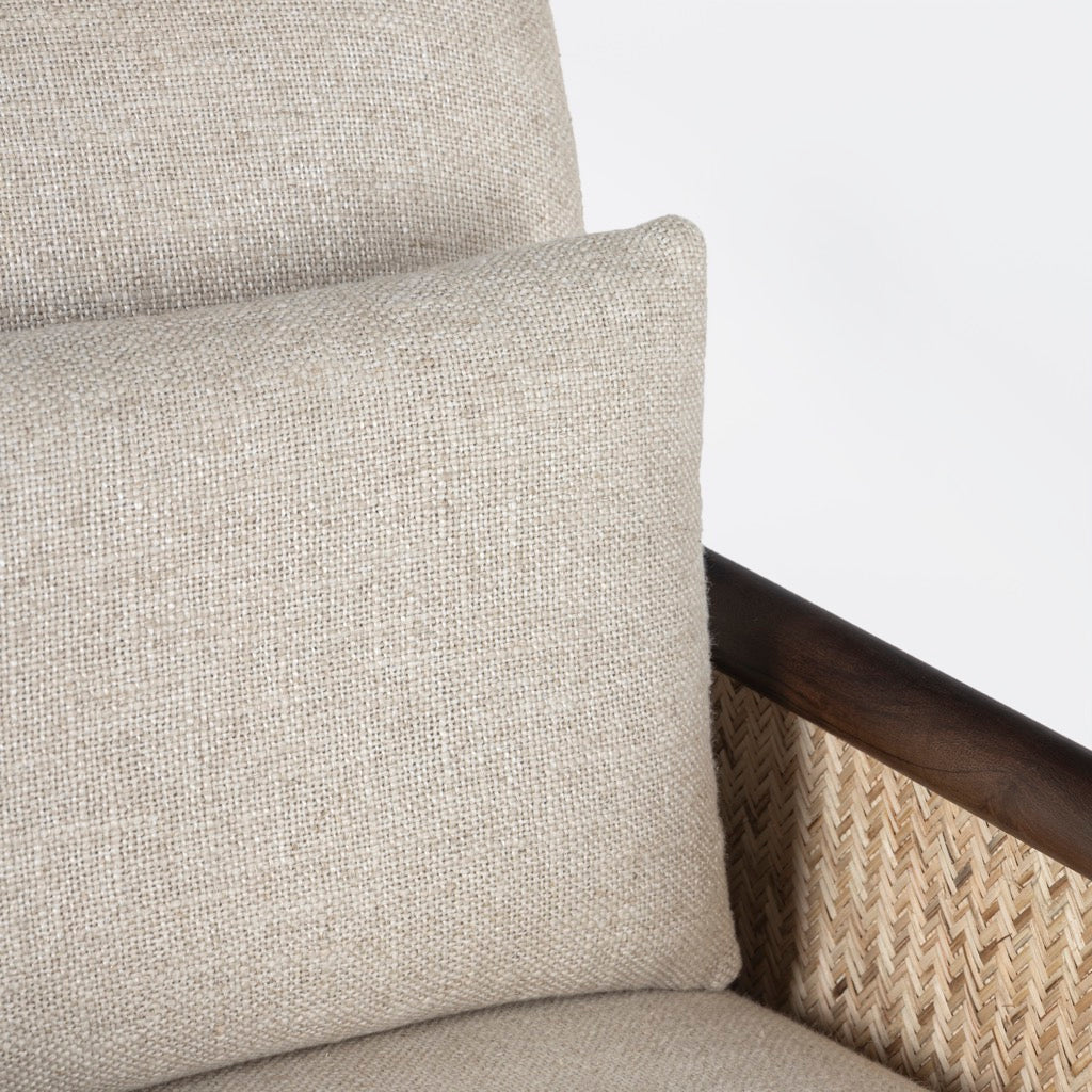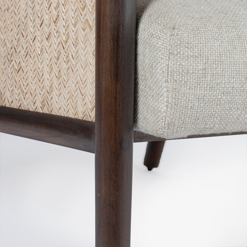 The Blake Armchair exudes timeless elegance with its sturdy acacia wood frame and warm walnut finish. Featuring natural cane on the arms for added texture, it’s beautifully upholstered in soft, natural linen.