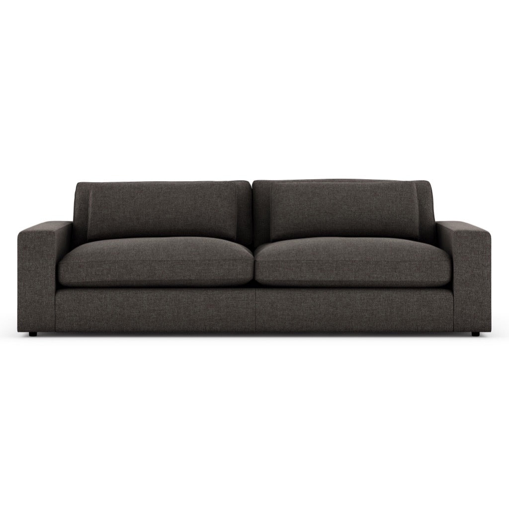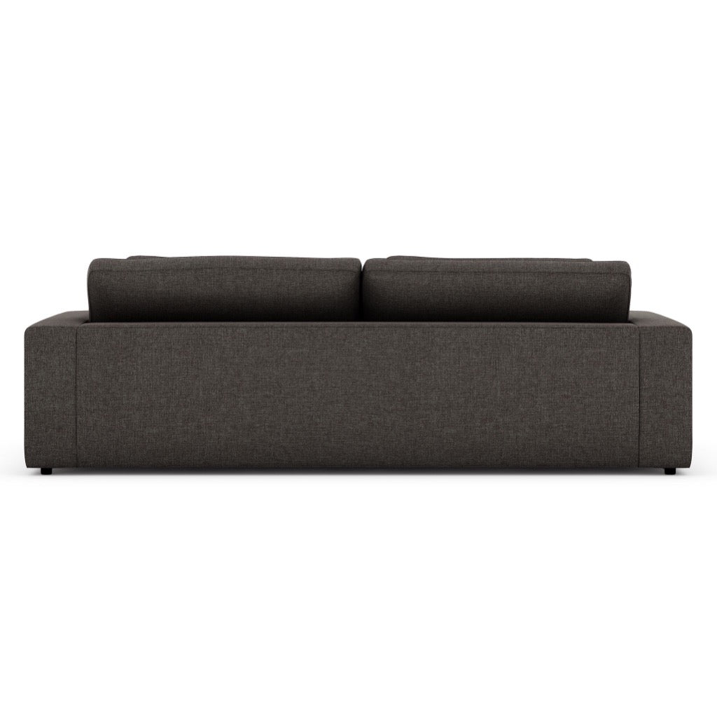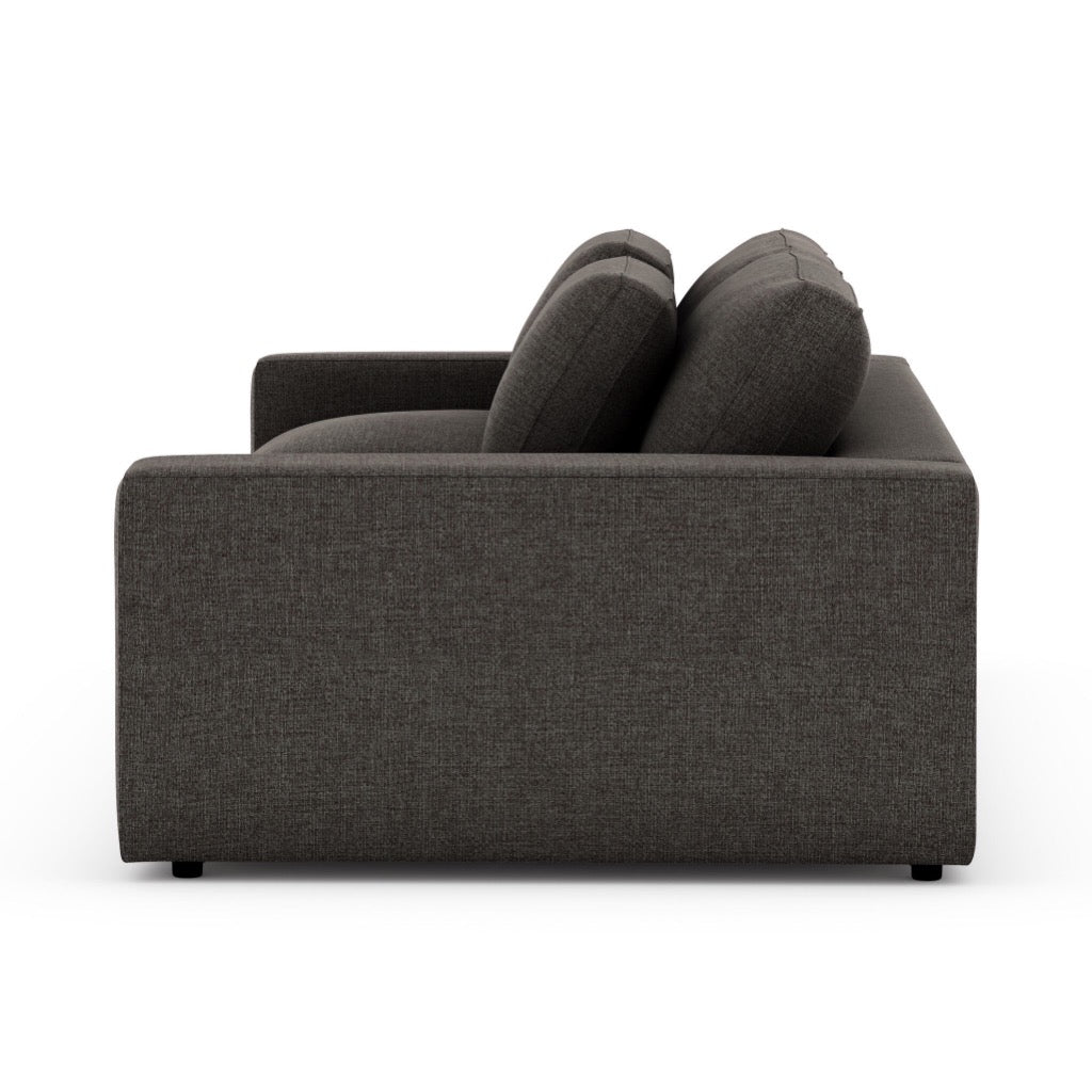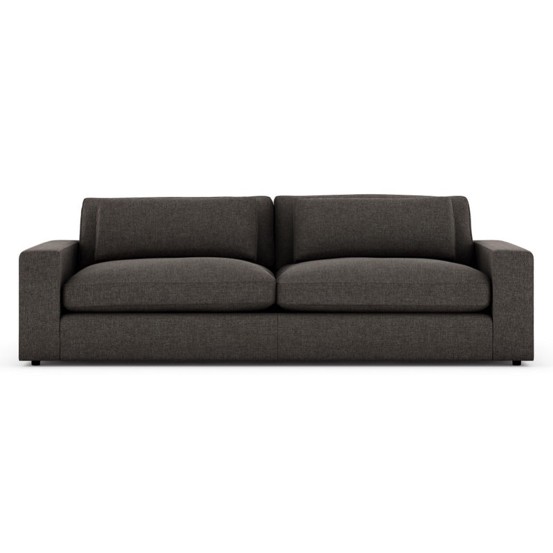 Deep, low seating says relax. An inviting sofa is covered in a durable woven fabric. Modular components allow the perfect combination for any space.
