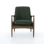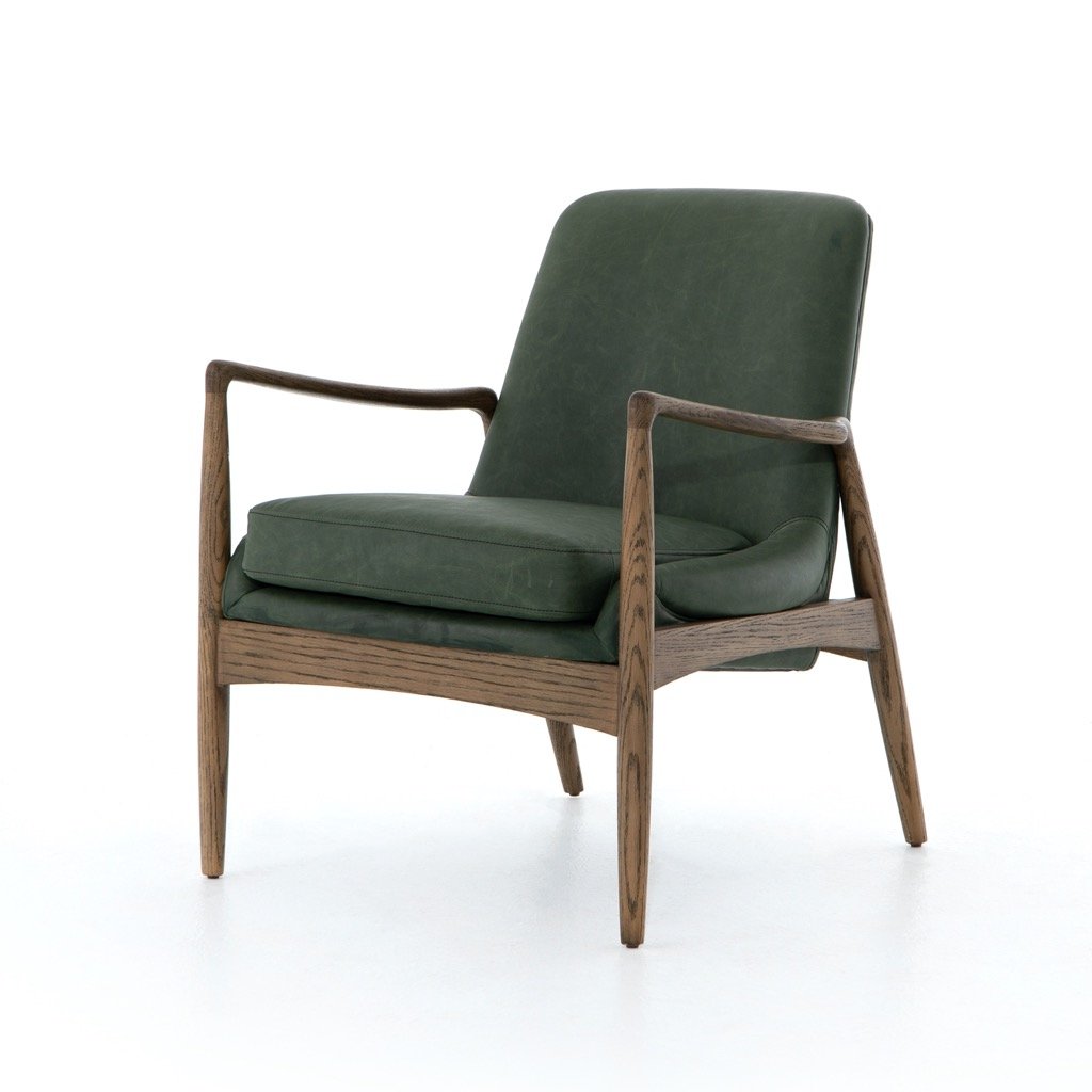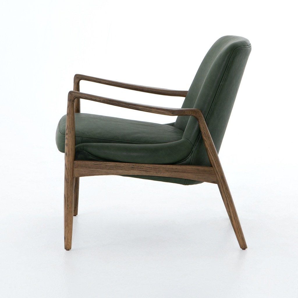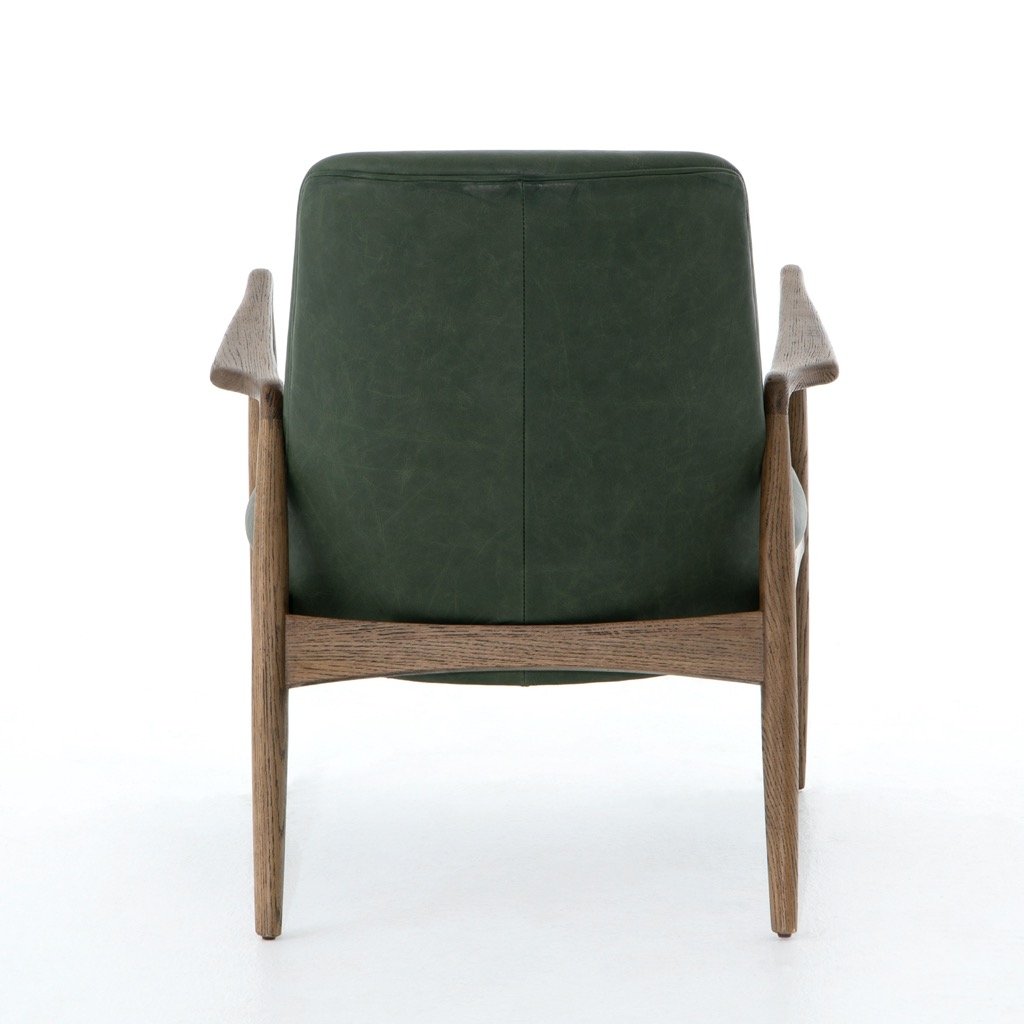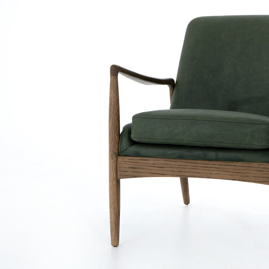 Dramatic arms and a deeper seat offer relaxation with mid-century modern sophistication. Sculpted oak framing adds an architectural feel to rich top-grain leather in a mossy sage.