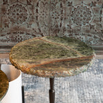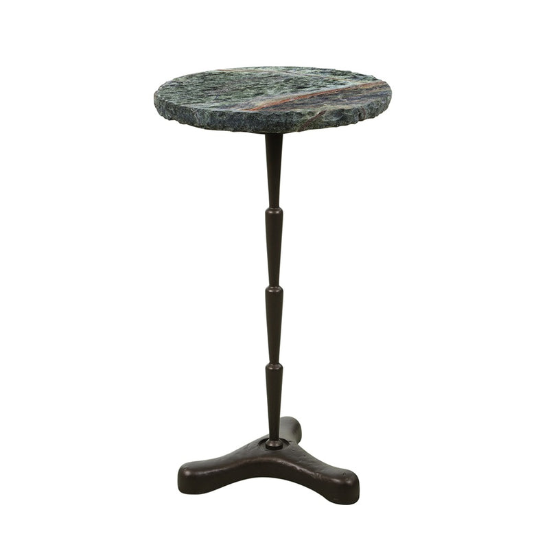 The Breton Accent Table features a striking green Bidasar marble top supported by a distinctive unique iron base. Its compact size and bold design make it a perfect accent piece for any room. The rich marble surface adds sophistication, while the iron base offers a modern, industrial touch. Ideal for adding a pop of color and style to your space.