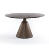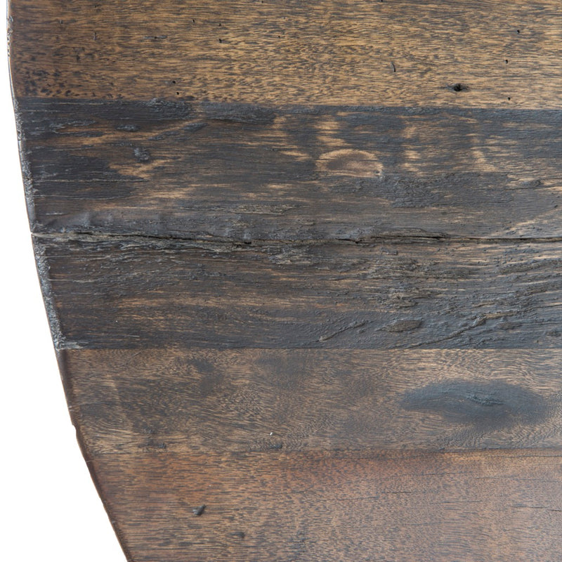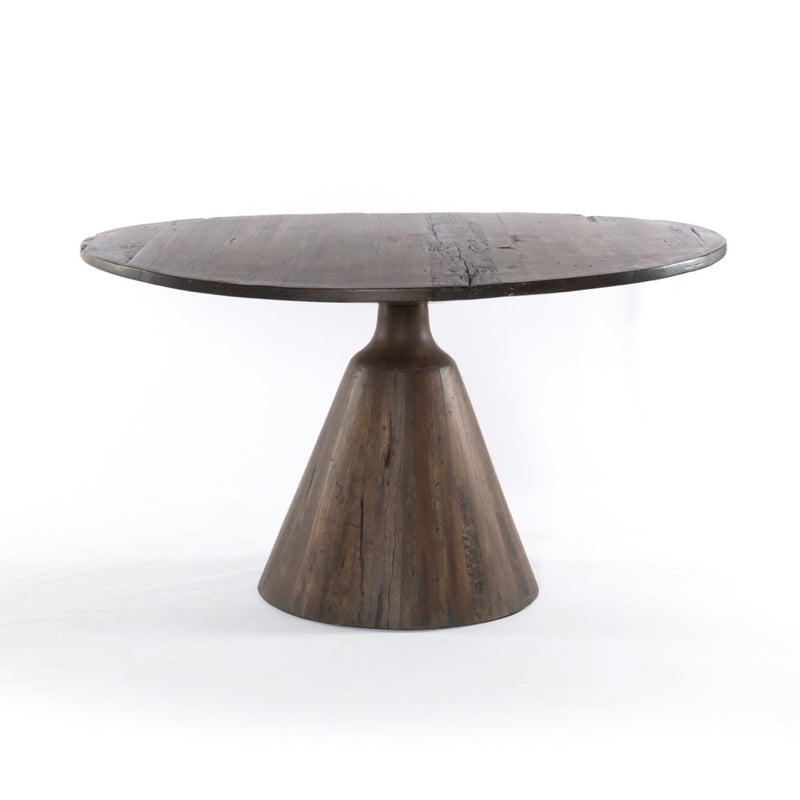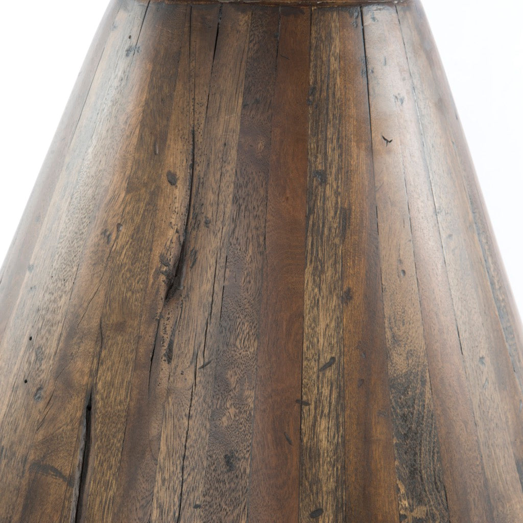 Organically shaped pedestal table takes aesthetic cues from nature. Character-rich knots and grains innate to India-sourced reclaimed woods are retained for display on a dramatically tapered base, then smoothed across the table top for a modern feel.