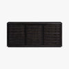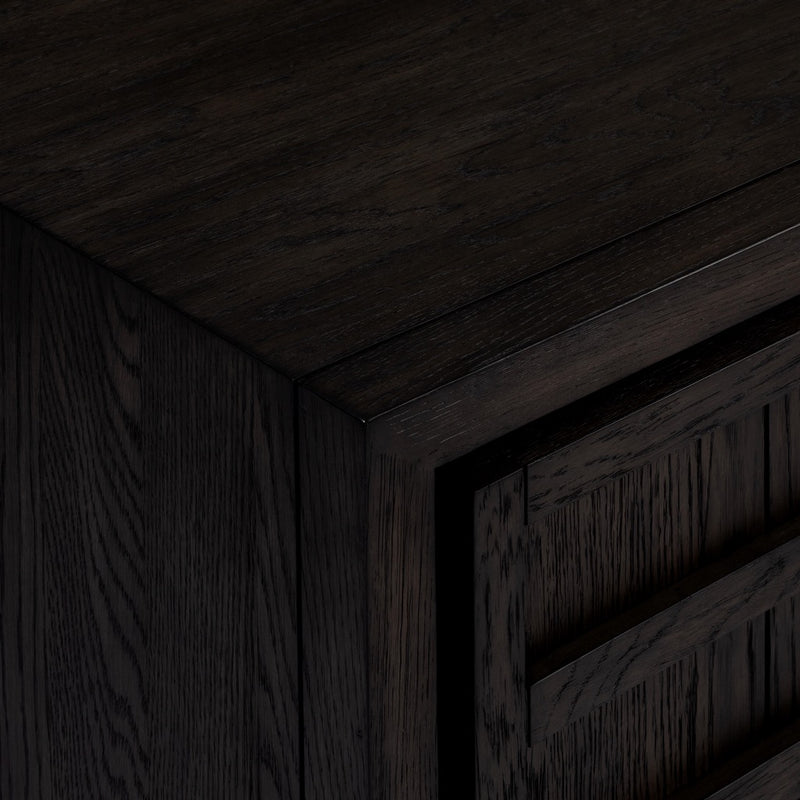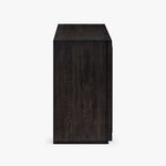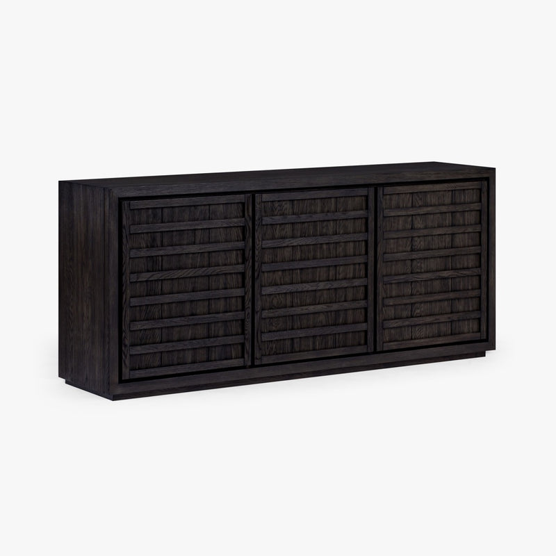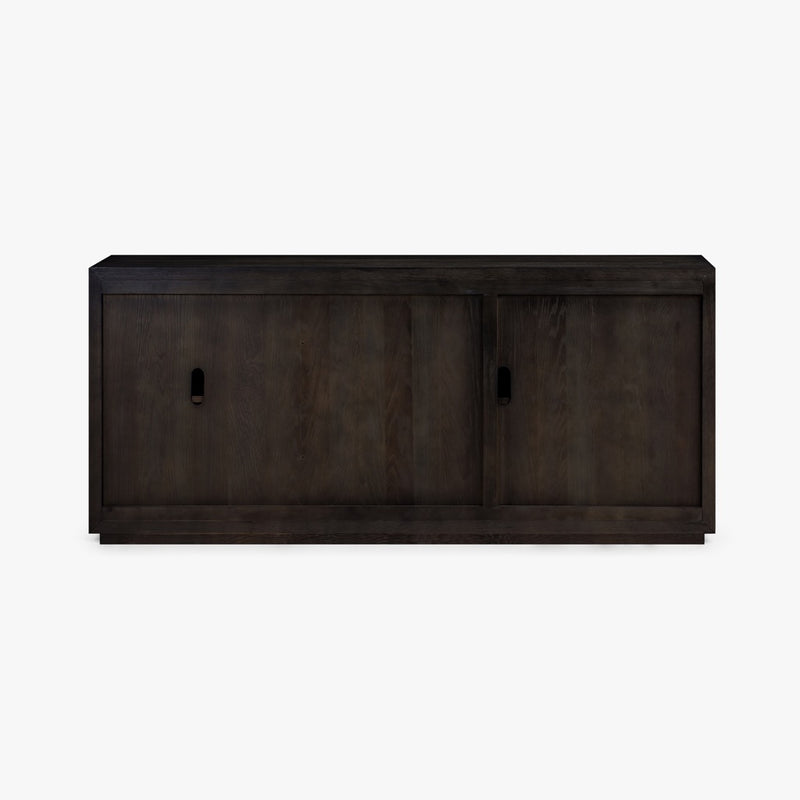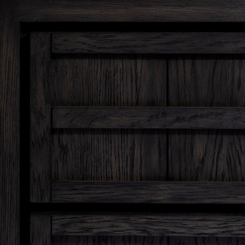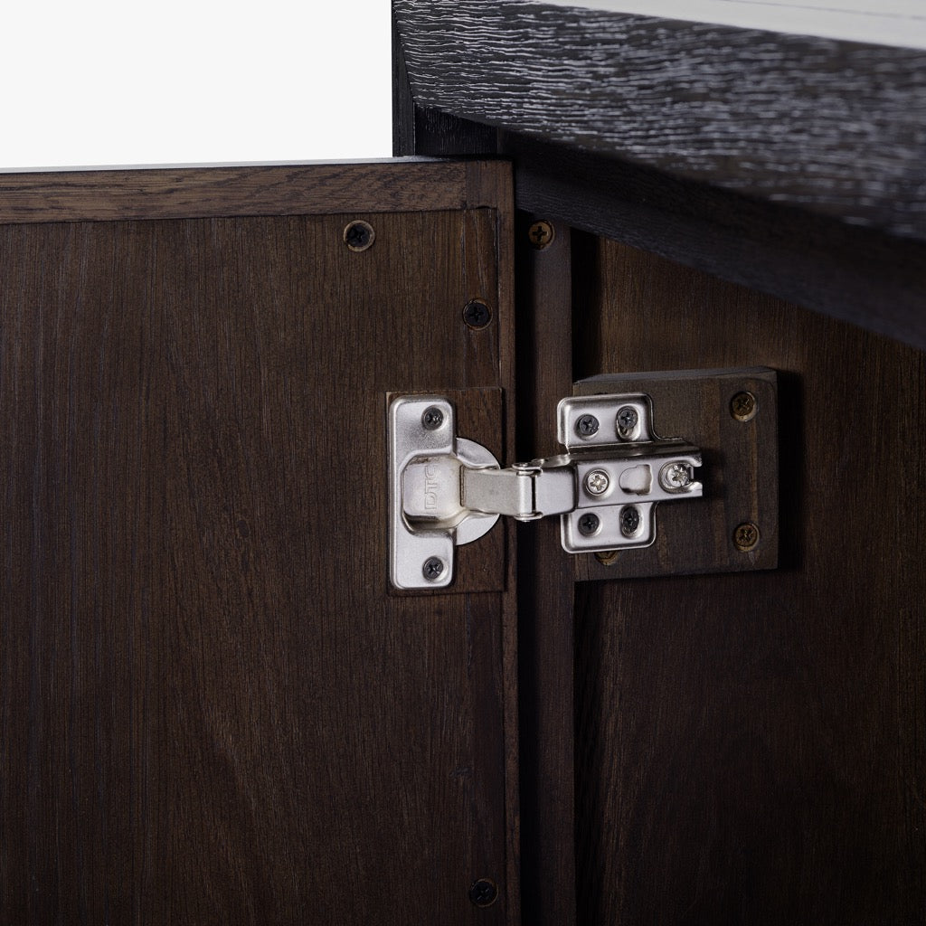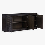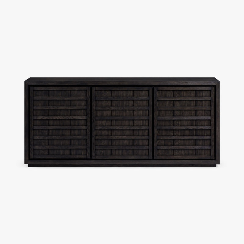 The Buddy Oak Buffet combines the beauty of natural oak wood with a textured finish achieved through a wirebrushing technique that showcases the depth and character of the wood grain. Ample storage is provided by adjustable shelving behind doors featuring push latch hardware. The door fronts are inspired by English-style windowpanes.