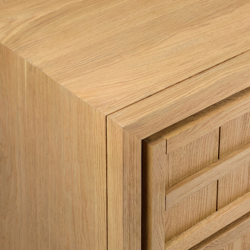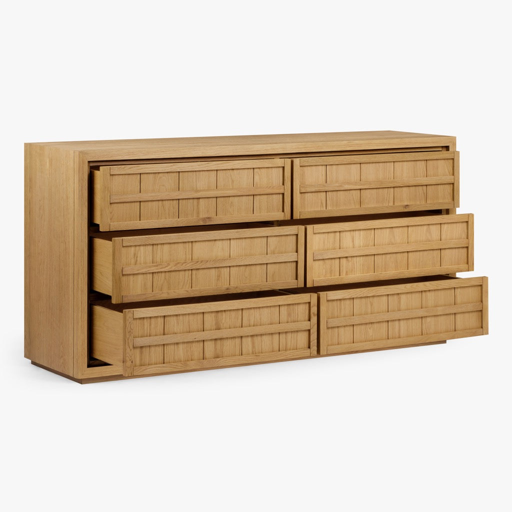 The Buddy dresser combines the beauty of natural oak wood with a textured finish achieved through a wirebrushing technique that showcases the depth and character of the wood grain. Ample storage is provided by 6 large drawers with soft closing hardware, with the drawer fronts featuring a windowpane inspired detail.