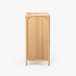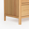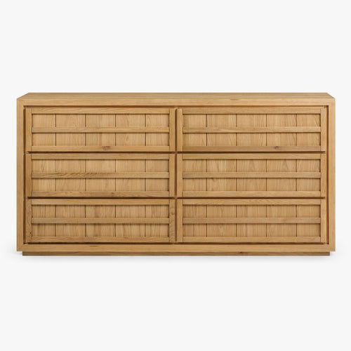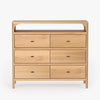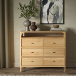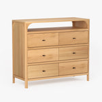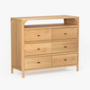 The Cali dresser is crafted from solid oak wood and oak veneers. The wood is hand finished with a walnut stain, which adds a warm and rich tone to the piece, and enhances the natural grain patterns of the oak. The open storage incorporates an arch detail, and allows you to keep your essentials within reach, or to display decorative objects. The antique bronze finished hardware and soft close drawer runners add to the heirloom quality of the piece. The 6-drawers provide ample storage for clothing, while the compact dimensions make this ideal for apartments and smaller spaces.