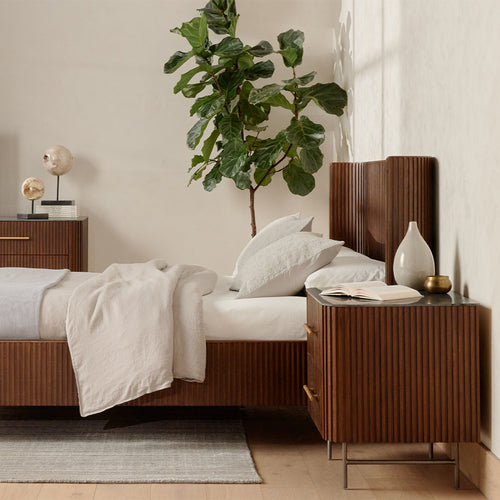 The Cali nightstand is crafted from solid oak wood and oak veneers. The wood is hand finished with a walnut stain, which adds a warm and rich tone to the piece, and enhances the natural grain patterns of the oak. The open storage incorporates an arch detail, and allows you to keep your essentials within reach, while the drawer helps maintain an organized and clutter-free space.