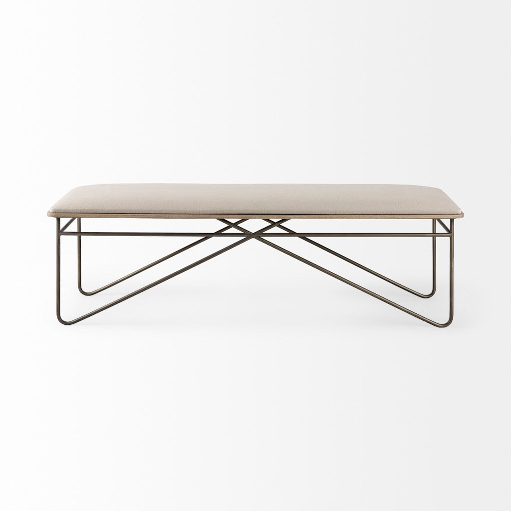 Camille is a cream color bench featuring plush fabric and sturdy metal framing.