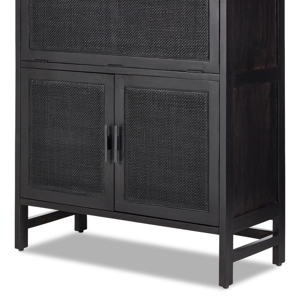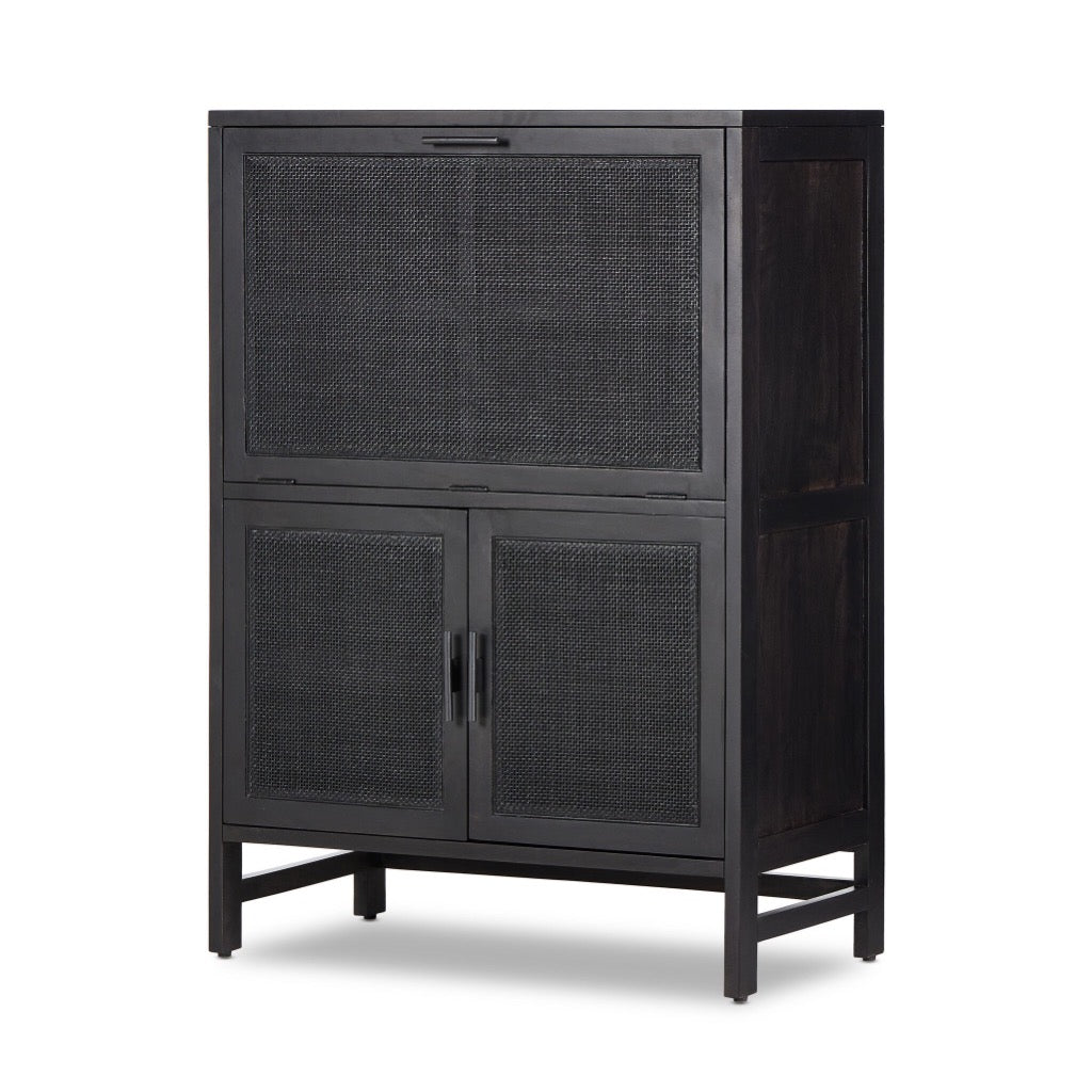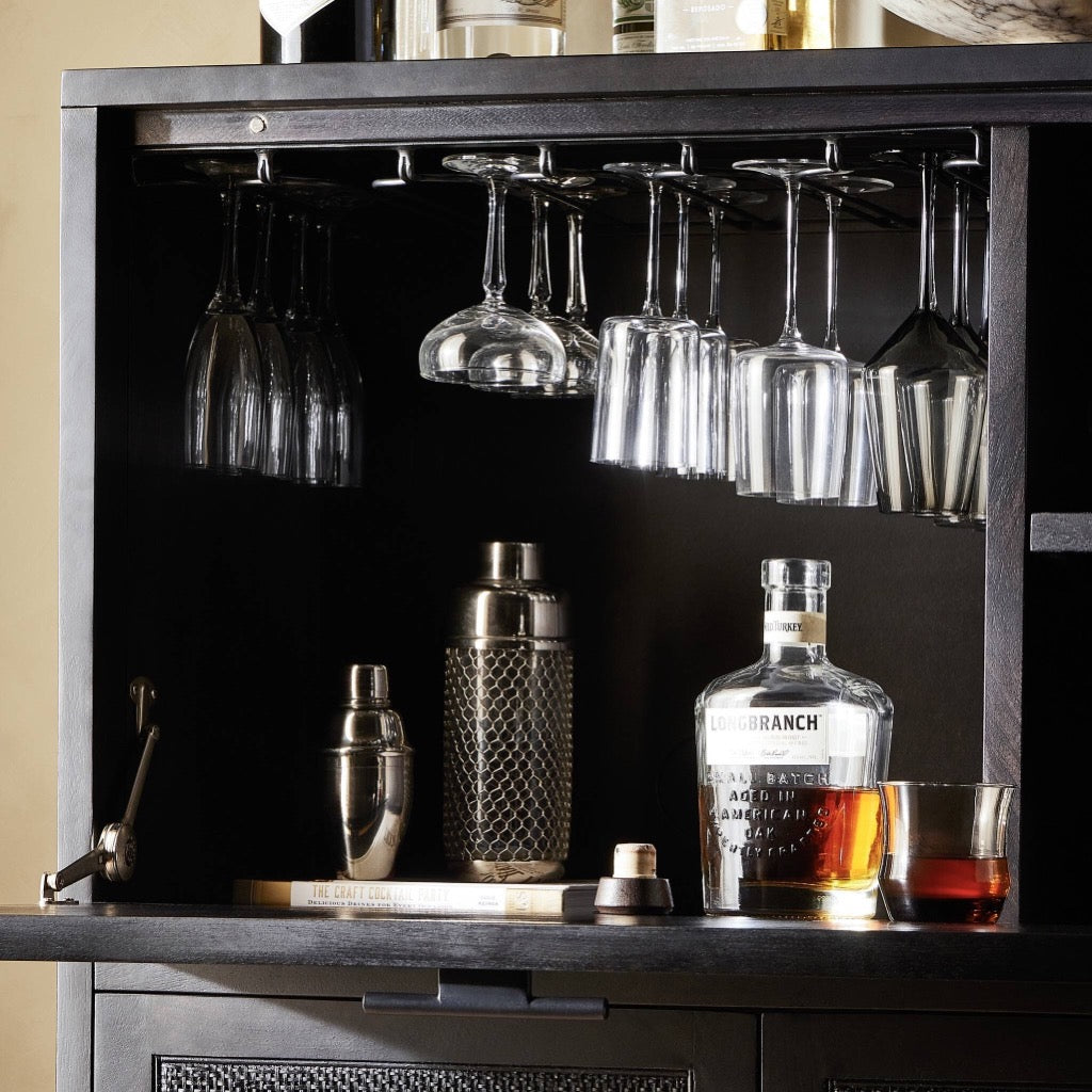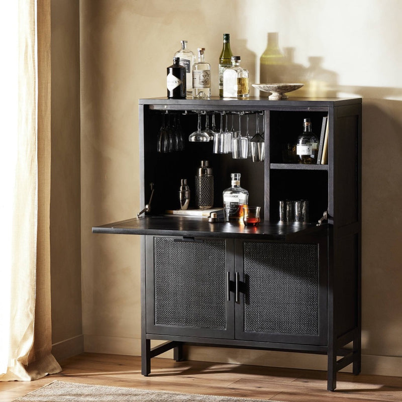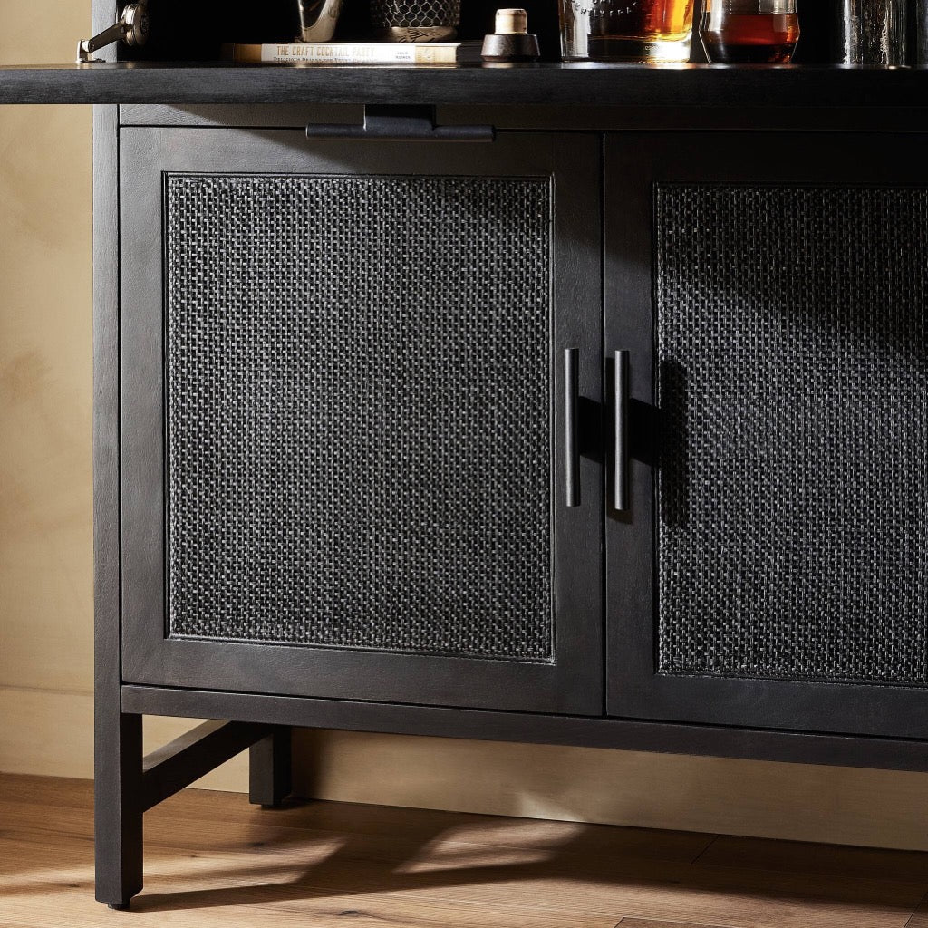 Solid black-washed mango frames natural woven cane, with gunmetal-finished iron hardware. A drop-down front opens to a 30" height, revealing spacious shelving for storage of stemware, bottles and barware. Surface can even be used as a makeshift workspace — the perfect place to pen a handwritten letter.