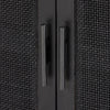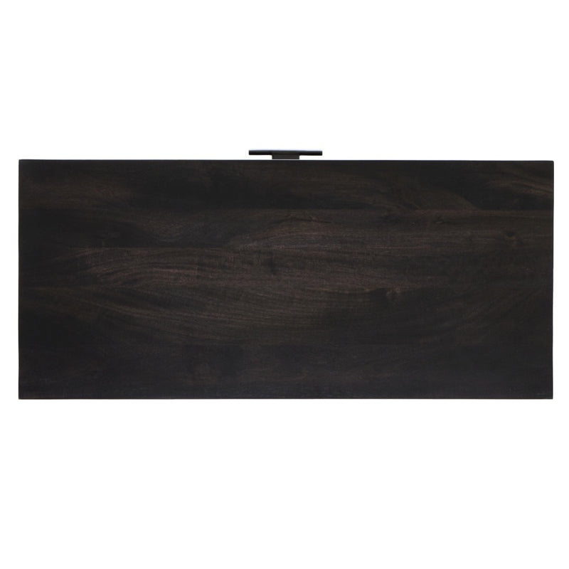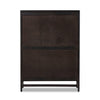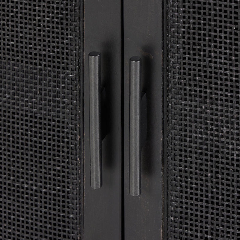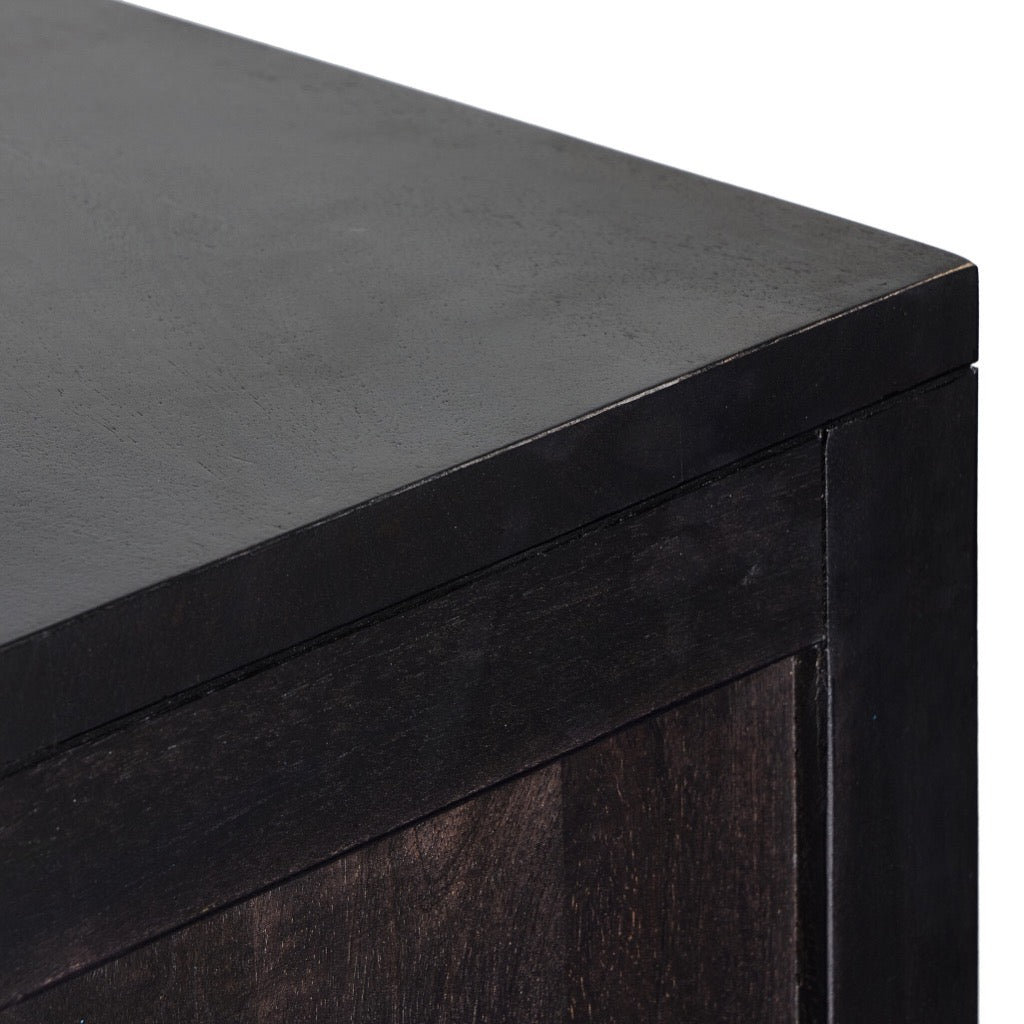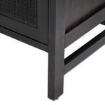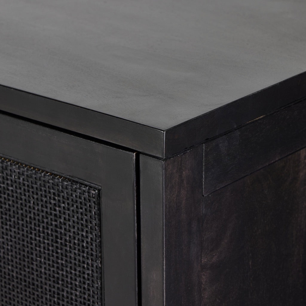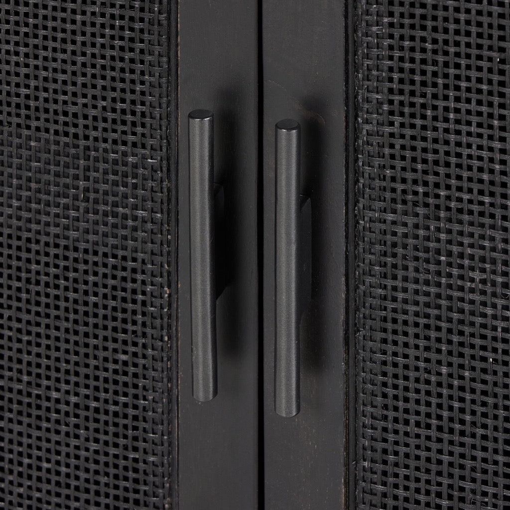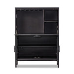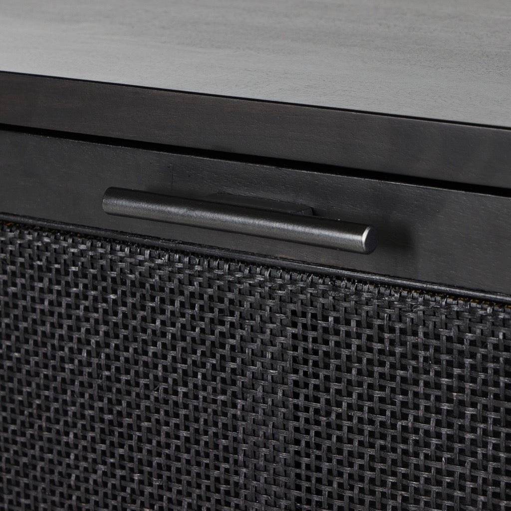 Solid black-washed mango frames natural woven cane, with gunmetal-finished iron hardware. A drop-down front opens to a 30" height, revealing spacious shelving for storage of stemware, bottles and barware. Surface can even be used as a makeshift workspace — the perfect place to pen a handwritten letter.